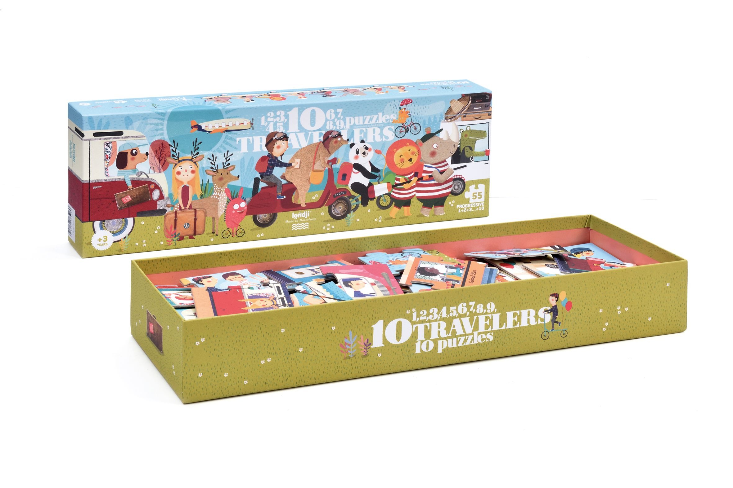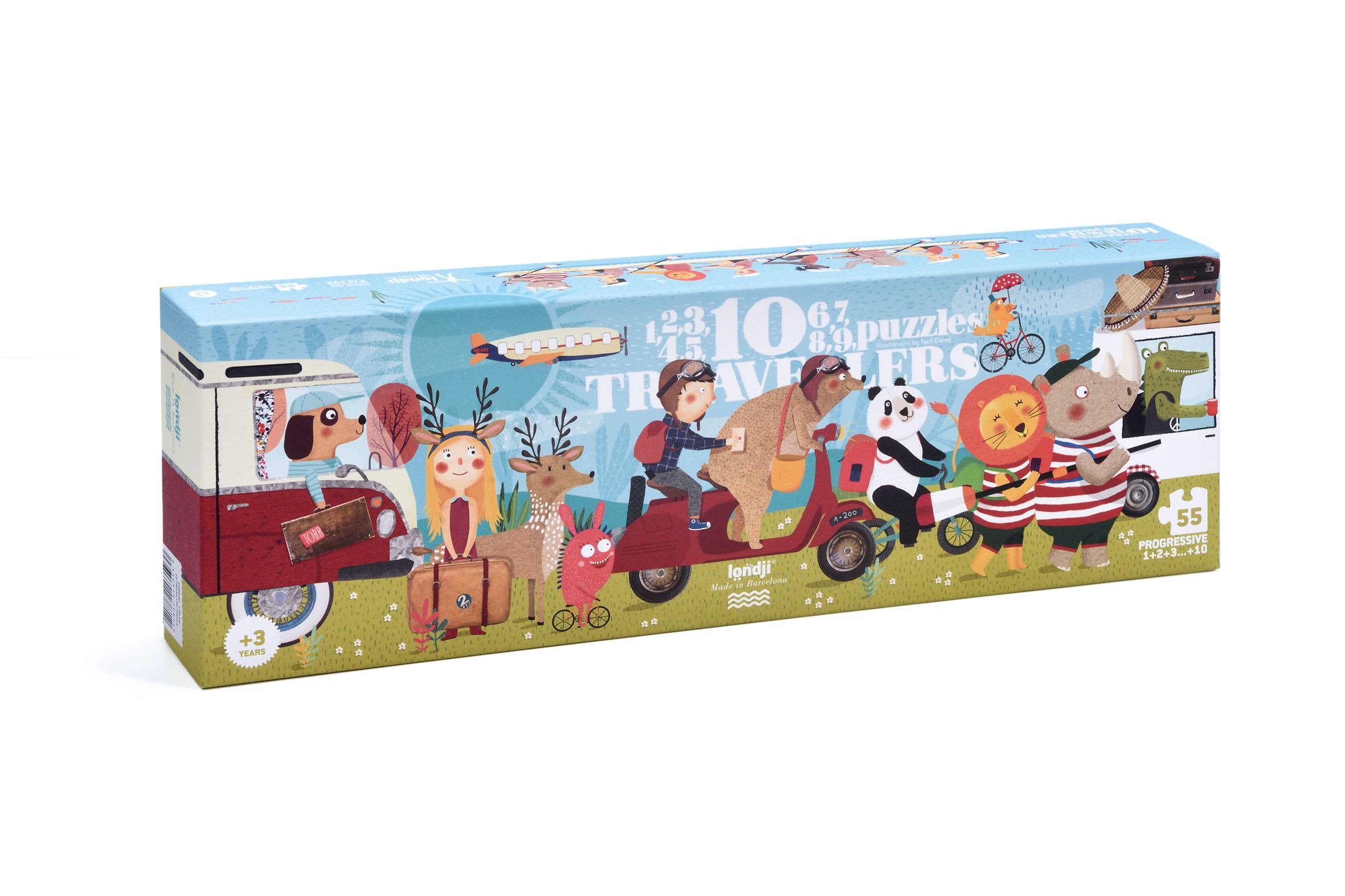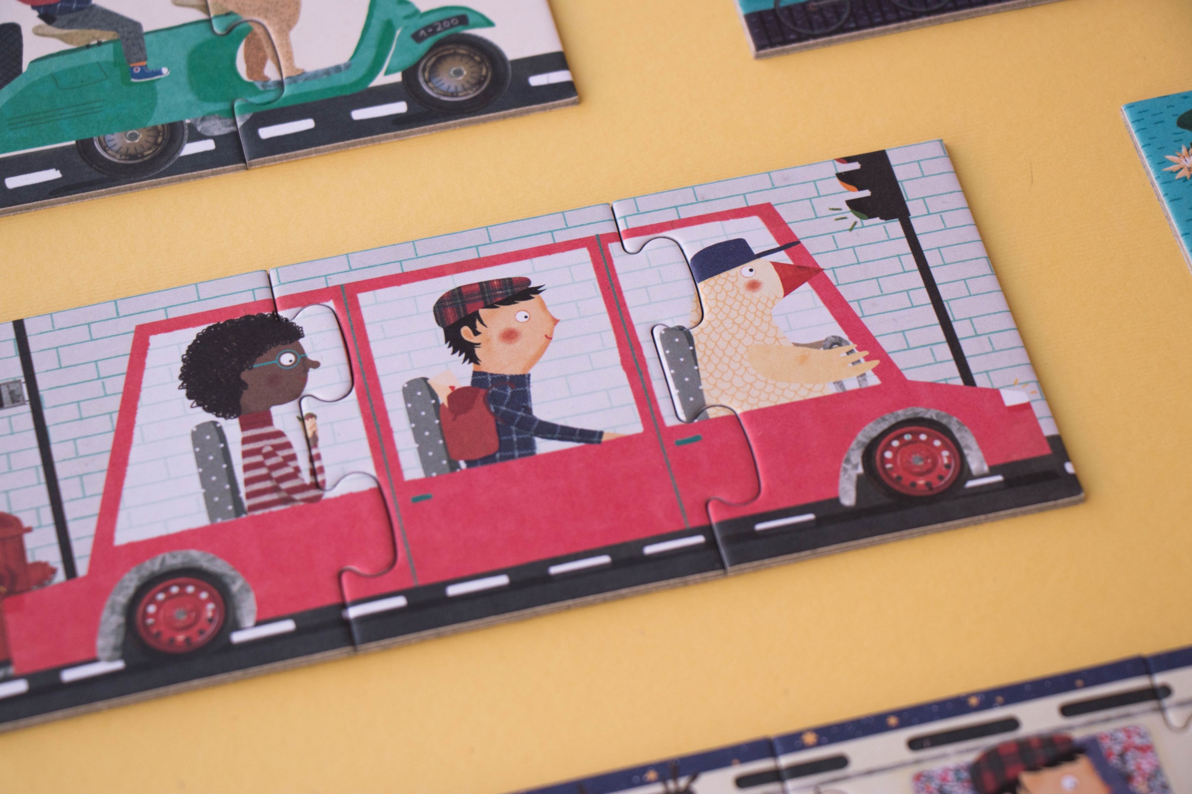 10 puzzles progresivos de medios de transporte, de 2 a 10 piezas, para aprender a contar de forma divertida.