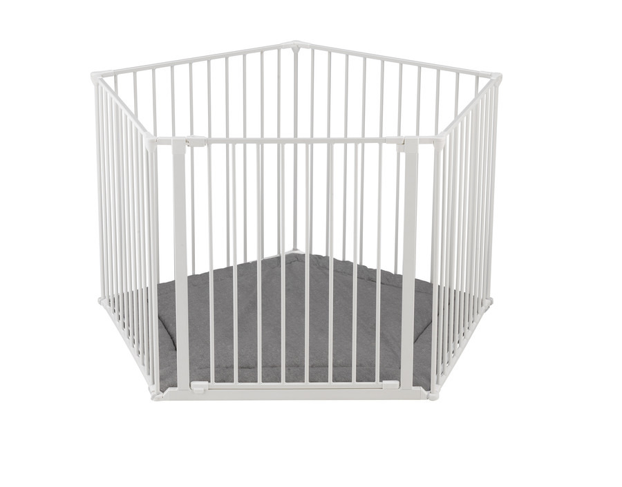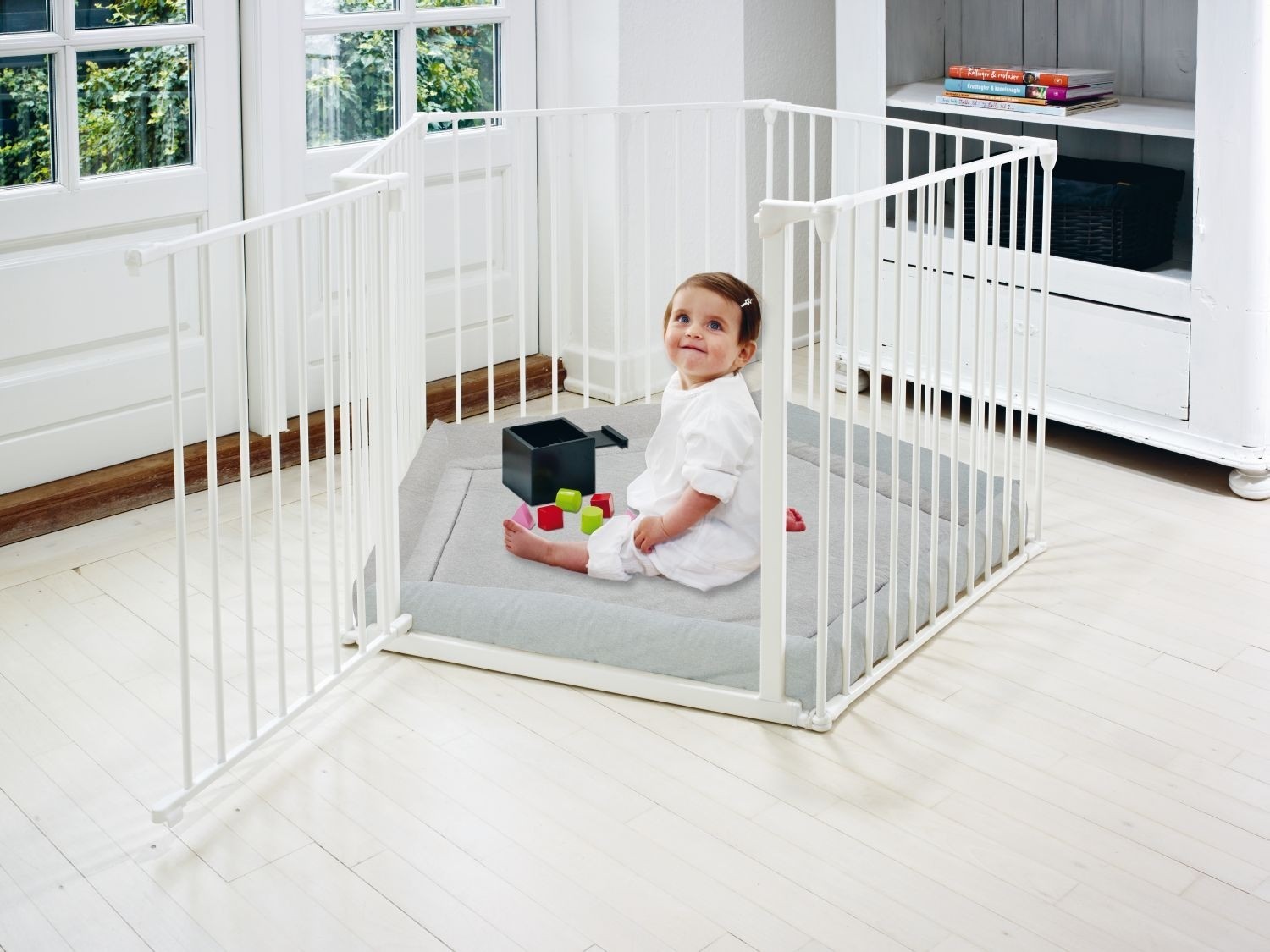 Baby Dan Park A Kid es un parque infantil práctico y muy fácil de usar. Dispone de una puerta excepcionalmente ancha que facilita sacar al niño sin agacharse. Cuando el parque ya no sea necesario, se puede transformar fácilmente en una puerta de seguridad para proteger pasillos amplios, una chimenea o escaleras.