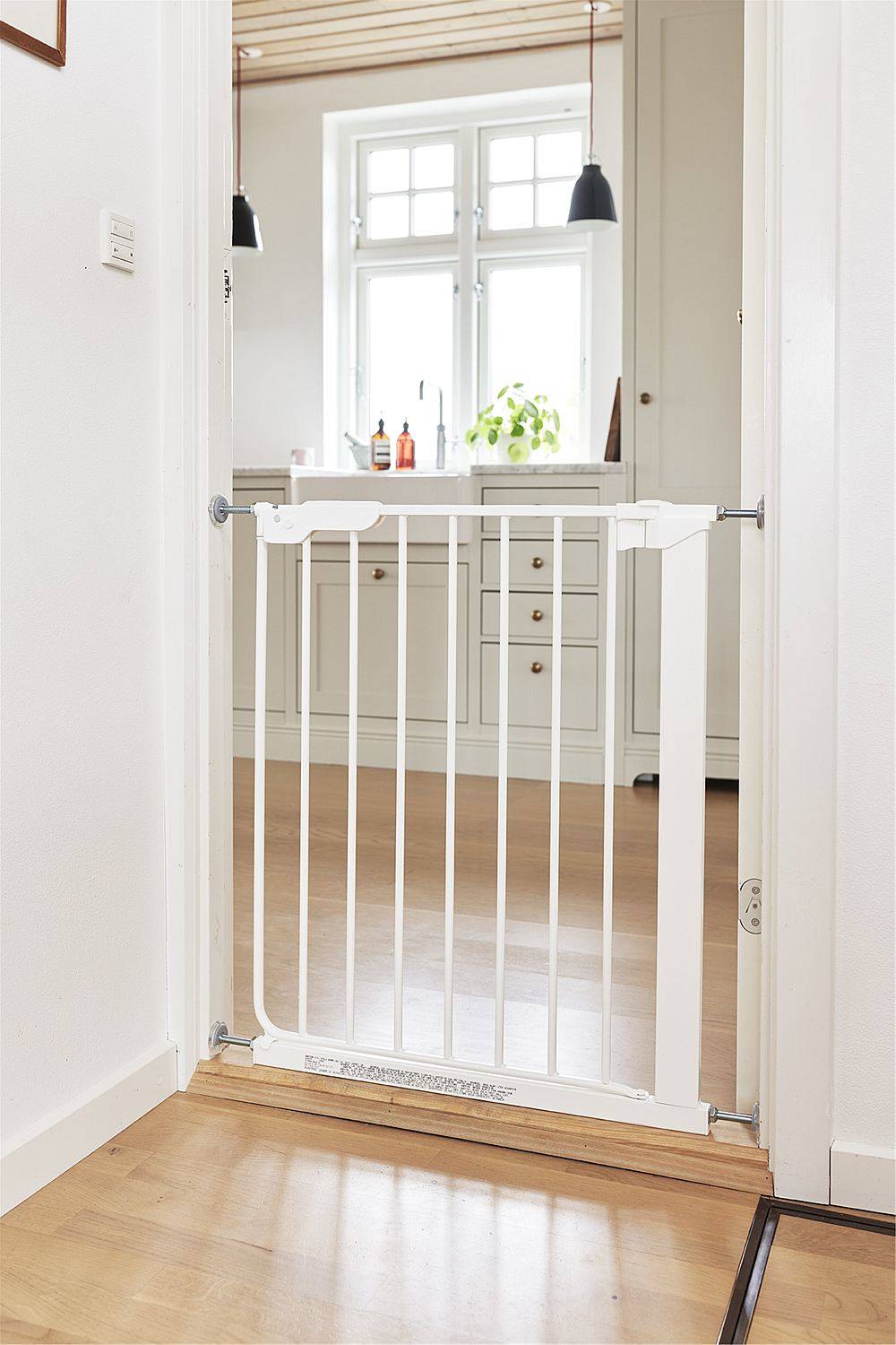 Ajuste a presión. li> Puerta de presión extra estrecha. Se puede ampliar con extensiones (disponibles por separado). Cumple con la última norma de seguridad EN1930. Apertura de 2 vías. Bloqueo triple. Apertura y bloqueo con 1 mano. Paso por encima de la barra. Amplia sección de paso . Altura 73 cm. Se adapta a aberturas de 60,5 a 66,5 cm.