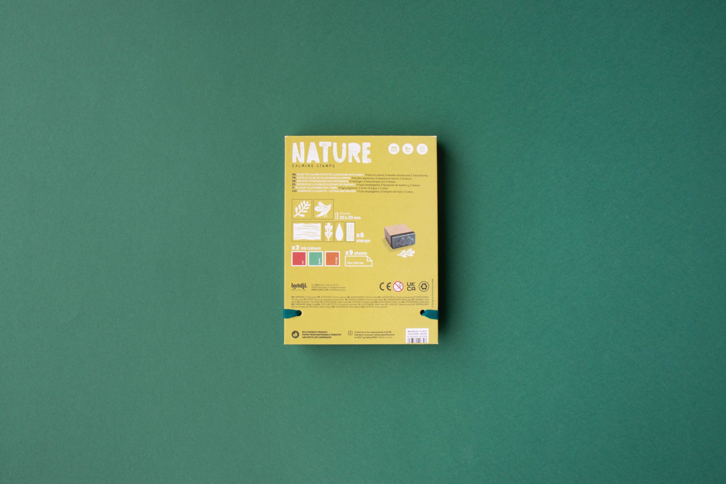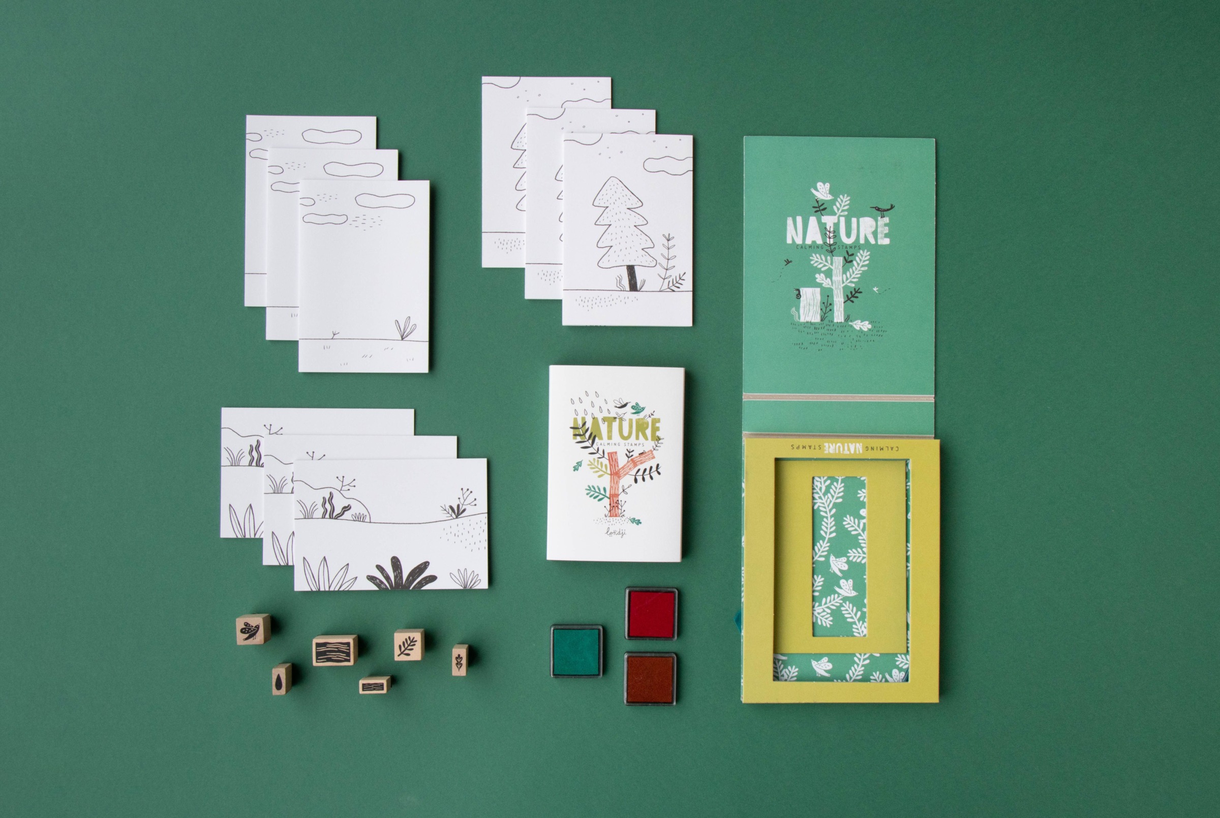 El juego incluye 6 tampones de madera, 9 hojas desplegables y tintas de 3 colores. Para niños mayores de 5 años.