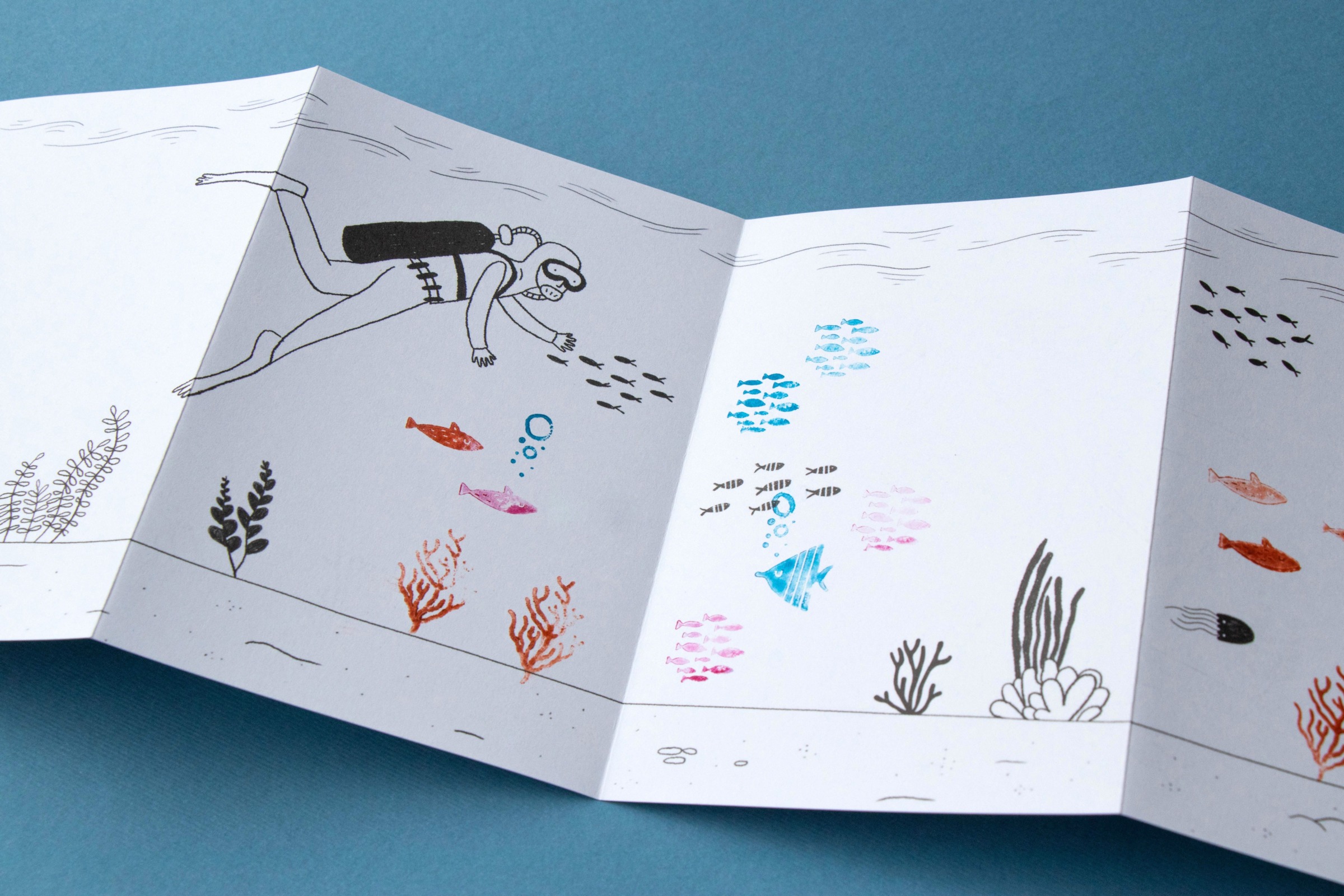Relájate con la repetición de dibujos hechos con tampones de bancos de peces de todo tipo y corales y crea tu propio fondo marino.