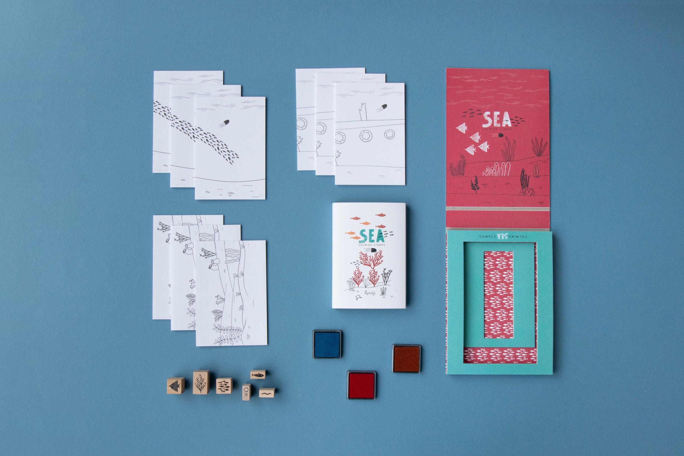 El juego incluye 6 tampones de madera, 9 hojas desplegables y tintas de 3 colores. Para niños mayores de 5 años.