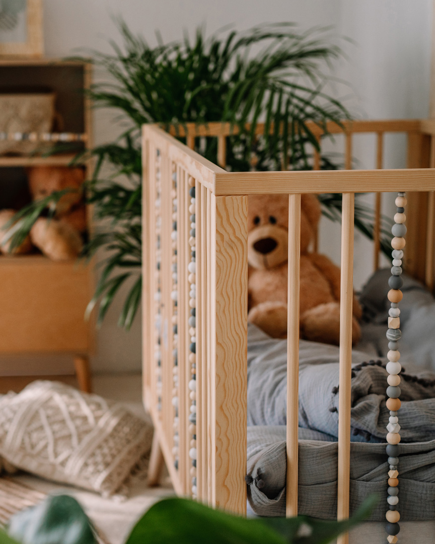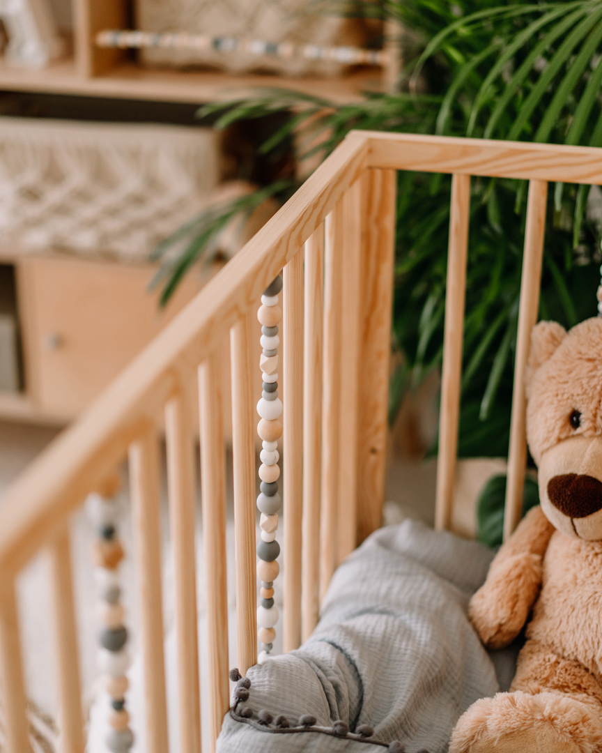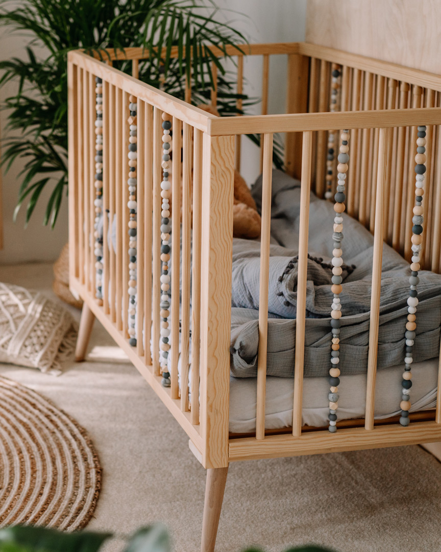 La cuna está decorada con un conjunto de bolitas sensoriales de madera y silicona, que apoyan el desarrollo del niño estimulando su sentido del tacto y la vista. Es la adición perfecta tanto para la habitación de niñas como de niños, especialmente cuando se combina con otros muebles sensoriales de Domo Kids, como la cómoda y el estante, creando un diseño armonioso en la habitación infantil.