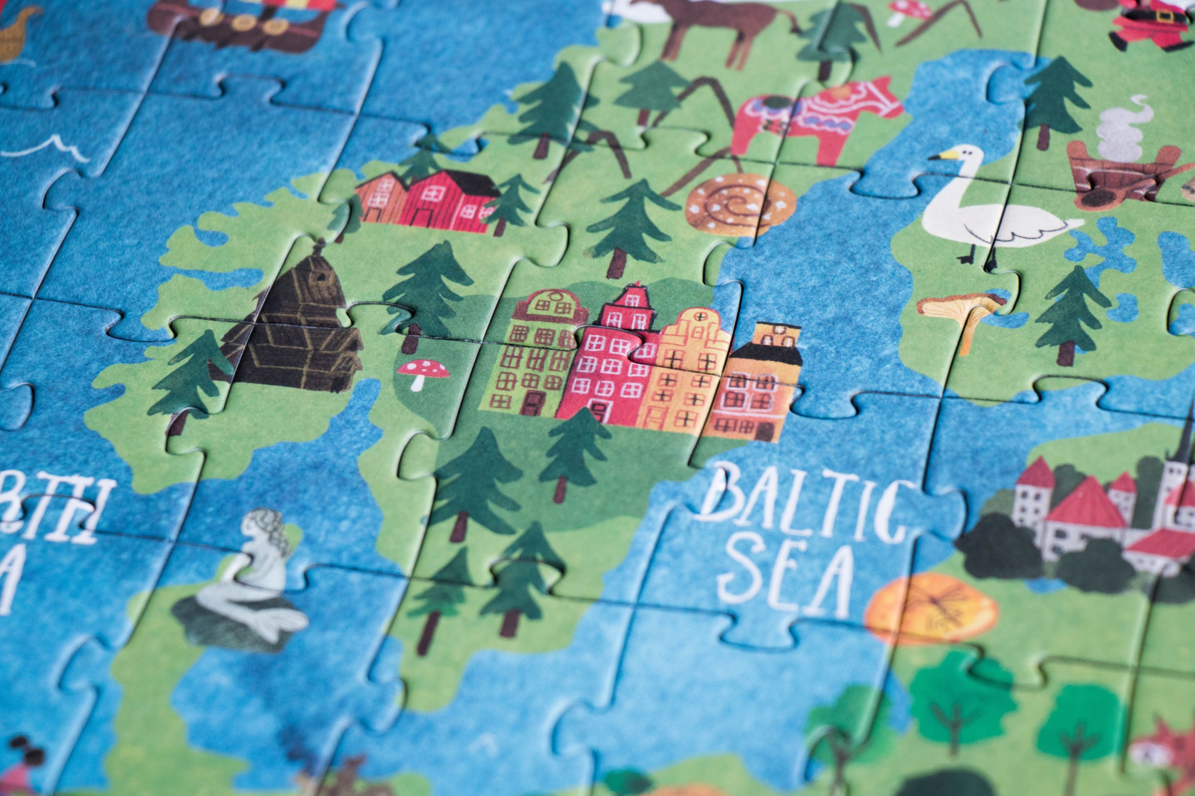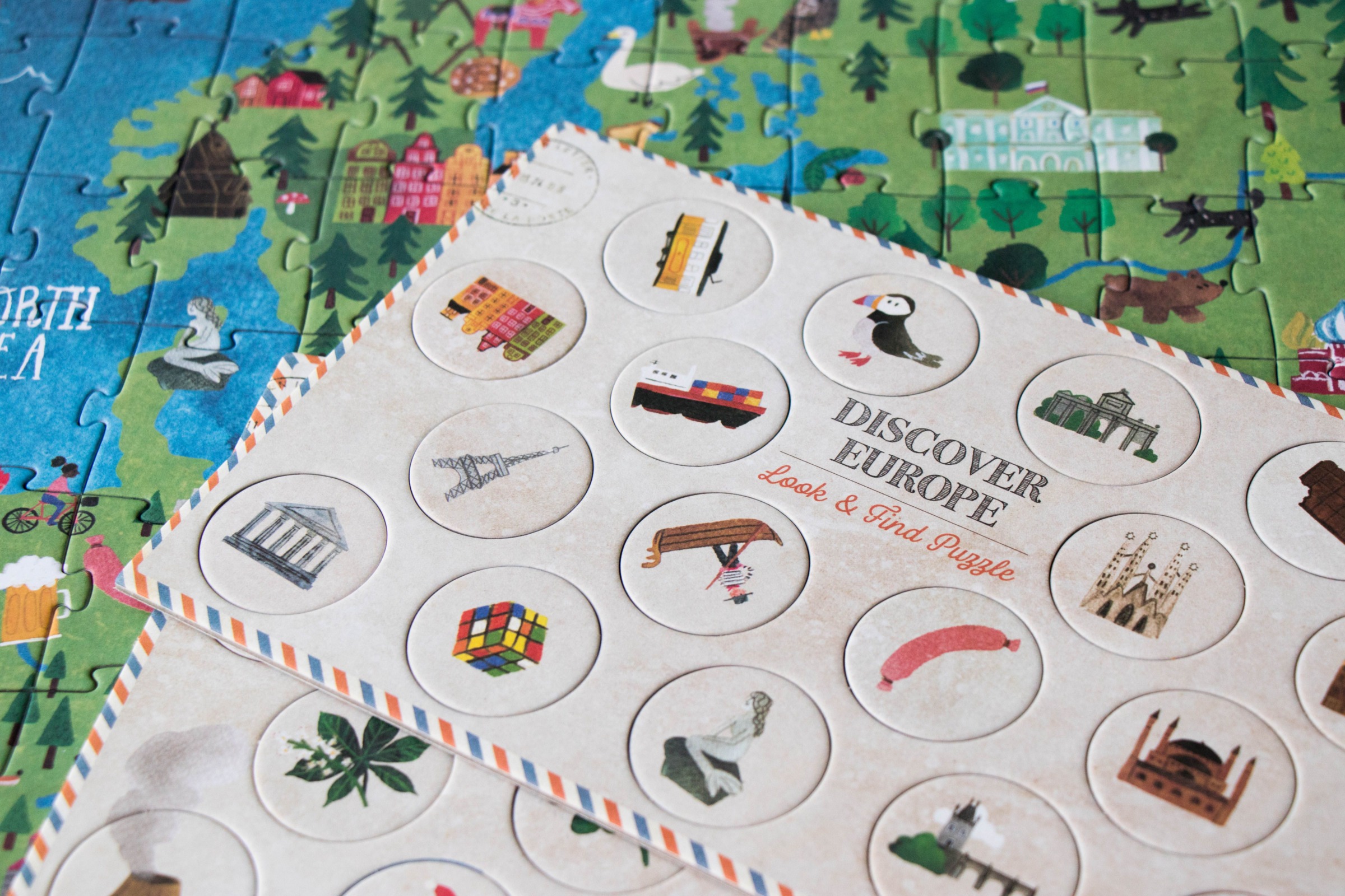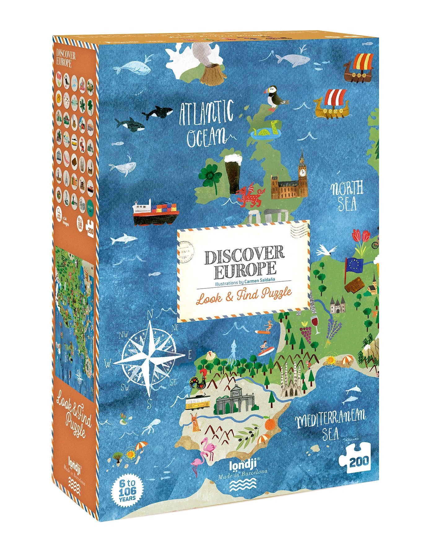 Un puzzle de 200 piezas y 34 fichas de observación de un mapa del continente europeo. Para niñas y niños desde los 7 años. Un juguete sostenible y de proximidad.