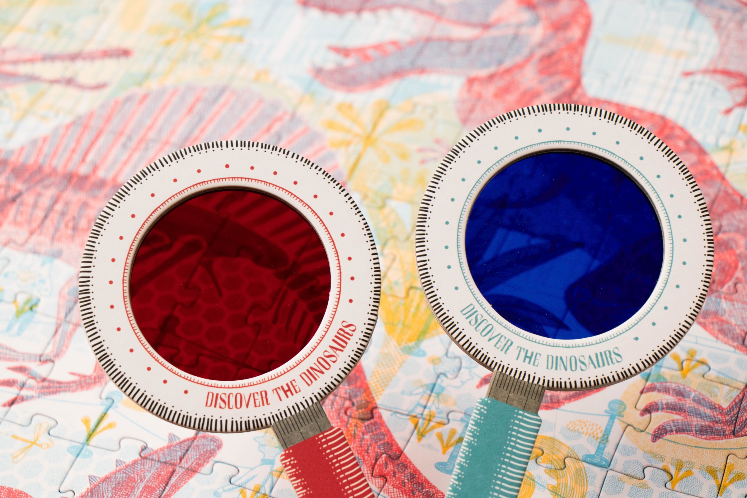 Un puzzle de 200 piezas muy original, con la lupa roja viajarás al Jurásico y con la lupa azul entrarás en el museo de ciencias naturales.