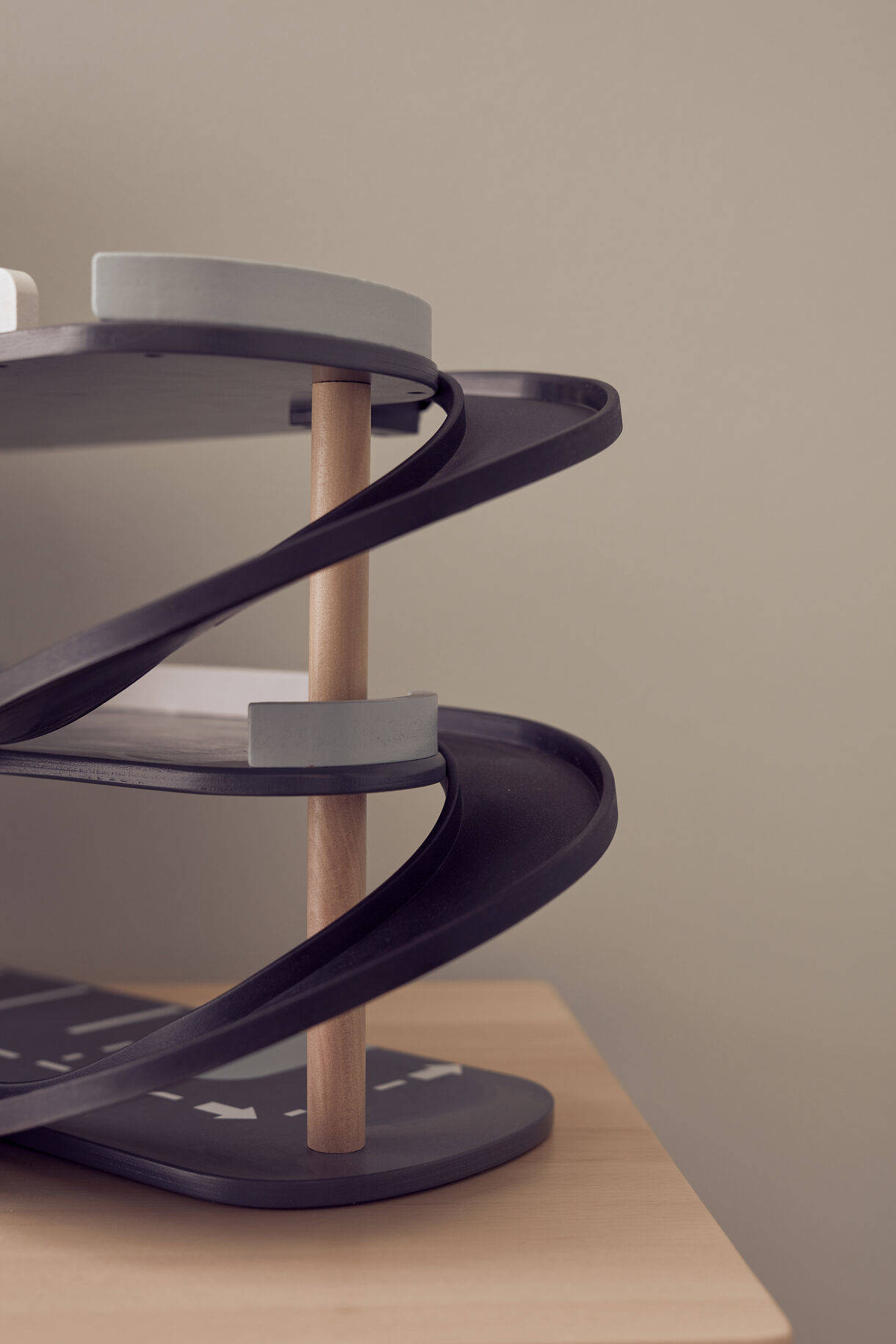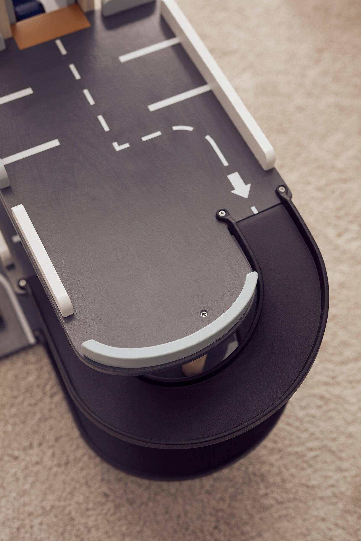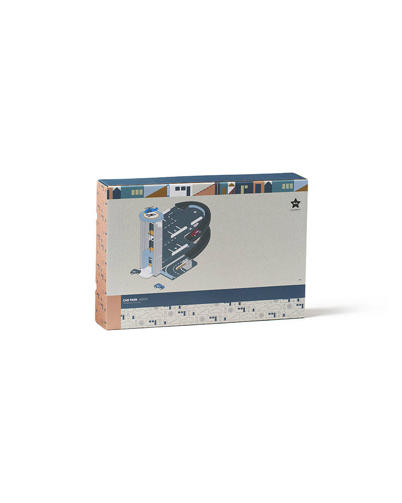 Ascensor: Contrachapado. Suelo: Contrachapado, Schima. Rampa: PP. Vehículos: Schima. Ruedas: ABS. Eje: Aluminio. Puerta: Lateral, Schima, Botón: Schima. Cordón Elevador: Poliéster.