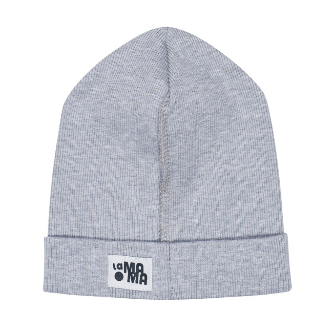 A beanie hat made of elastic ribbed fabric.