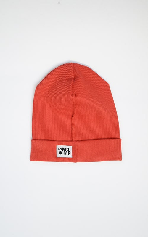 A beanie hat made of elastic ribbed fabric.