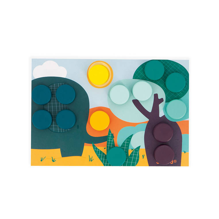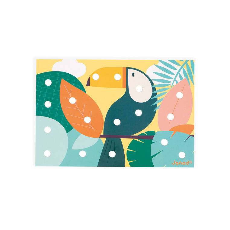 Mi primer mosaico de la marca francesa JANOD es un juguete creativo para un niño pequeño que aprende a distinguir y combinar colores y entrena el agarre y la llamada motricidad fina. El juego consta de 6 tableros de cartón grueso con agujeros recortados, en los que se deben colocar elementos redondos de madera de un color acorde con el fondo en un lugar determinado de la ilustración. Las imágenes tienen colores y temas universales (lugares y animales interesantes, por ejemplo, tucán en la jungla, elefante en la sabana, oso en las montañas, etc.) que atraerán la atención del niño, independientemente del sexo. El juego incluye 38 ladrillos redondos con un diámetro de 3,6 cm.