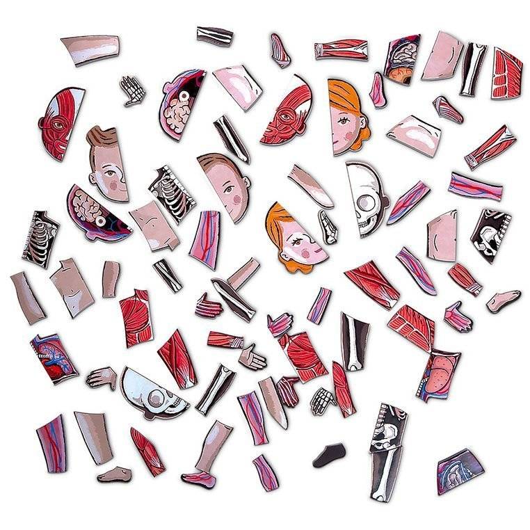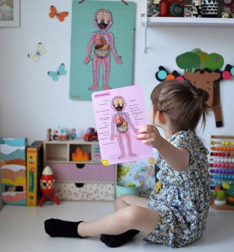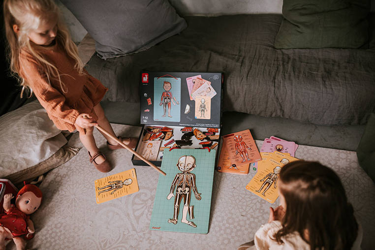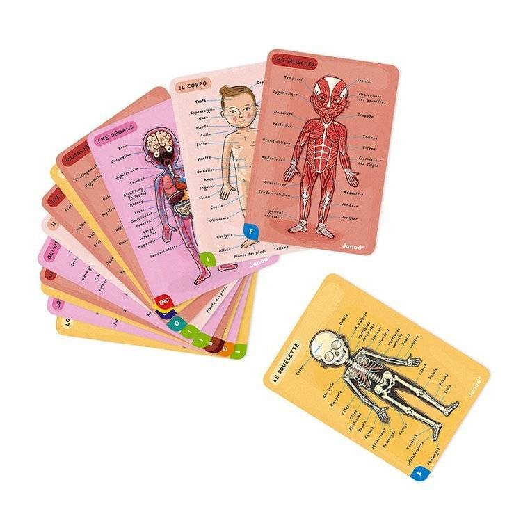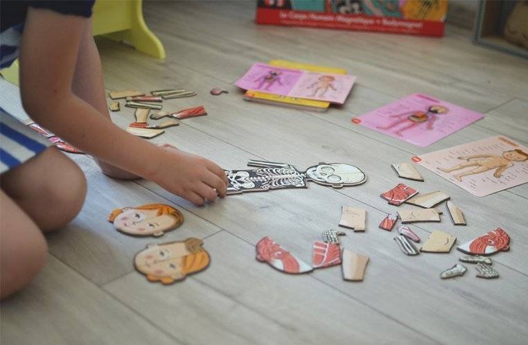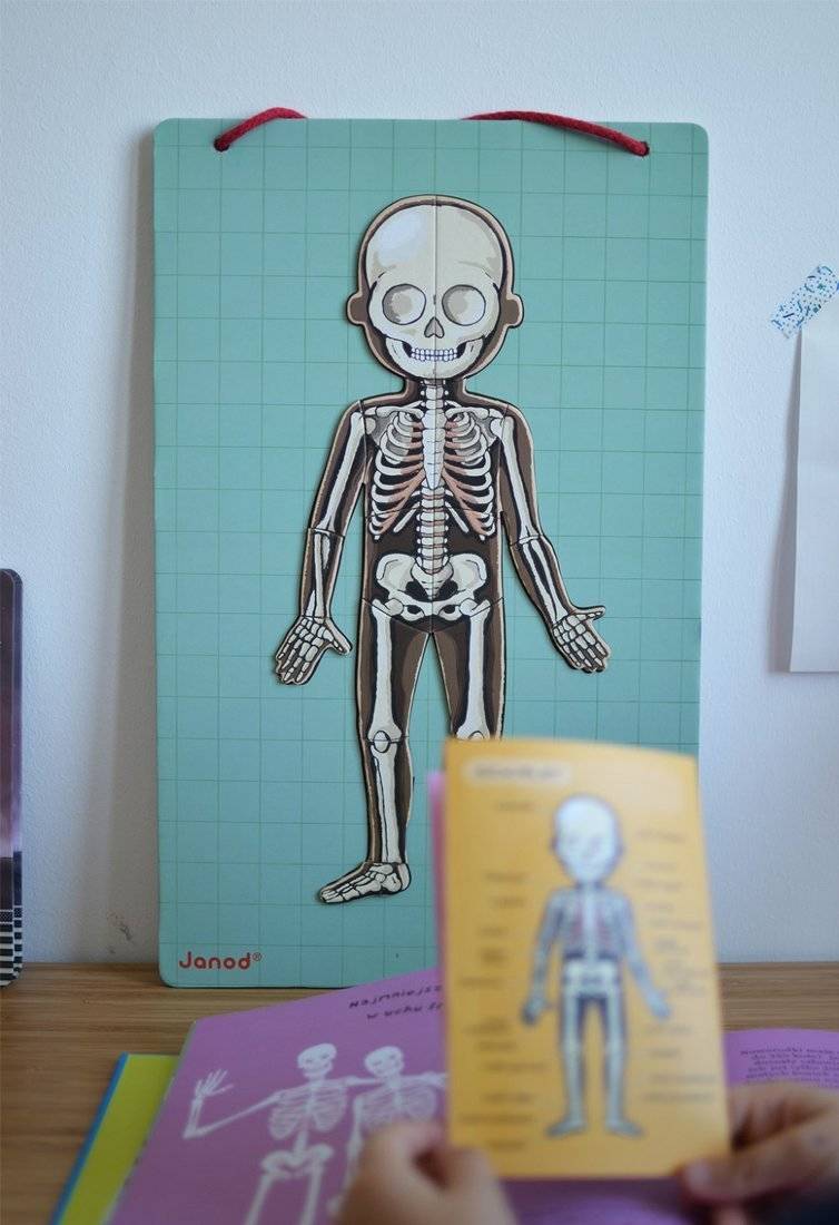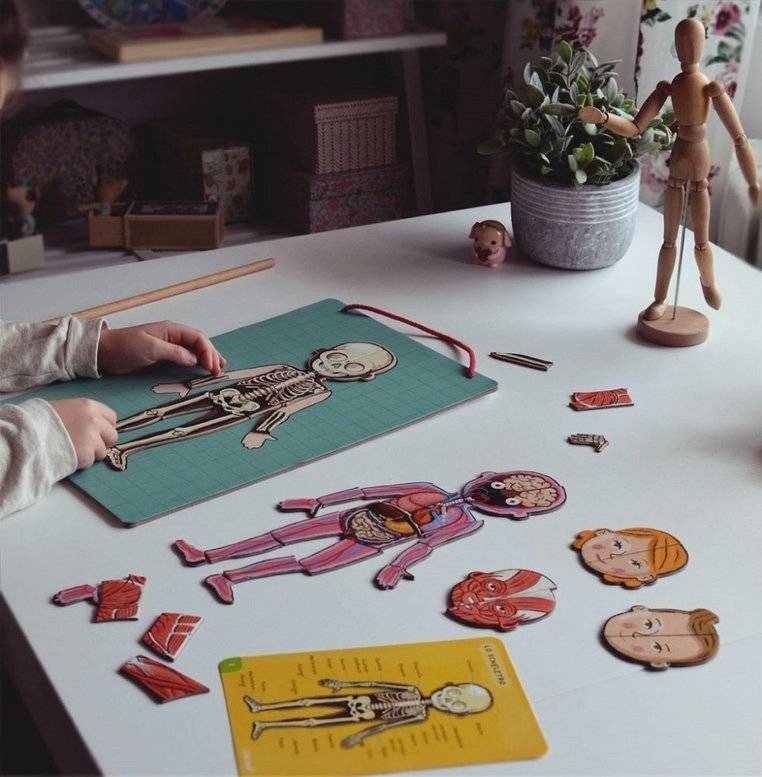 El rompecabezas magnético del cuerpo humano de la marca francesa Janod es un rompecabezas educativo que le enseñará a su hijo a construir el cuerpo humano en 11 idiomas (incluidos inglés, alemán, italiano y español). Gracias al juego, el niño aprenderá los nombres de partes del cuerpo, órganos, huesos y músculos. El kit incluye: una pizarra magnética, 18 tarjetas de referencia con partes del cuerpo marcadas en diferentes idiomas, 76 partes del cuerpo magnéticas y un puntero de madera.