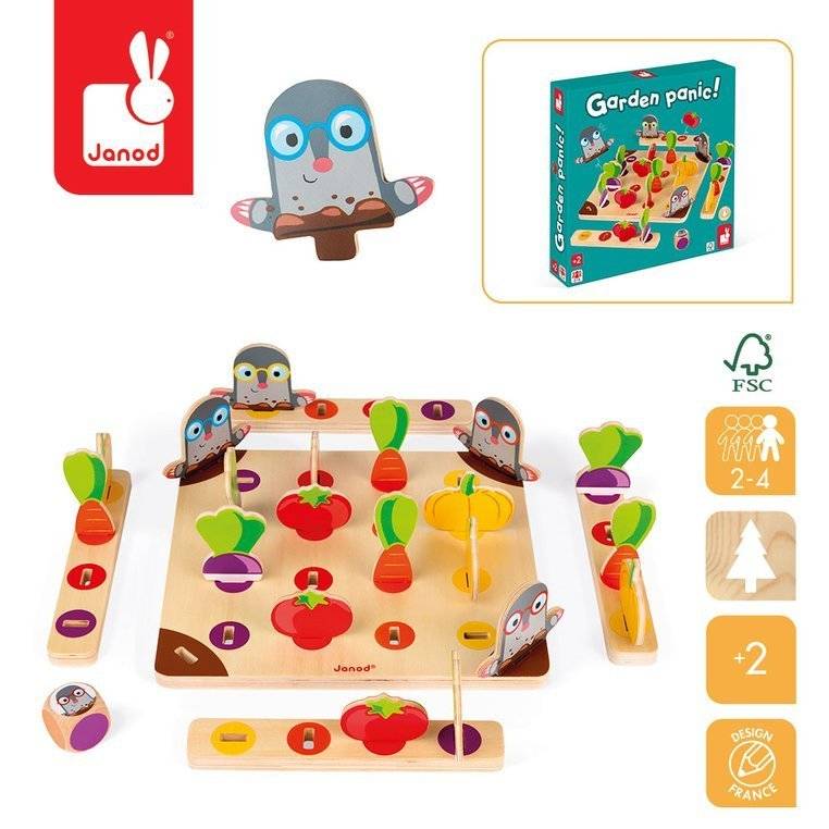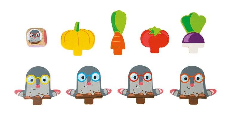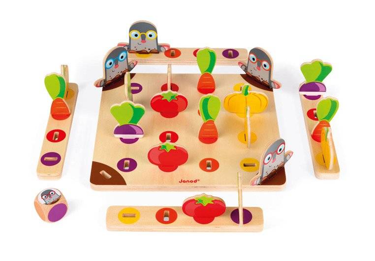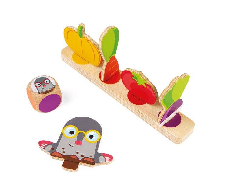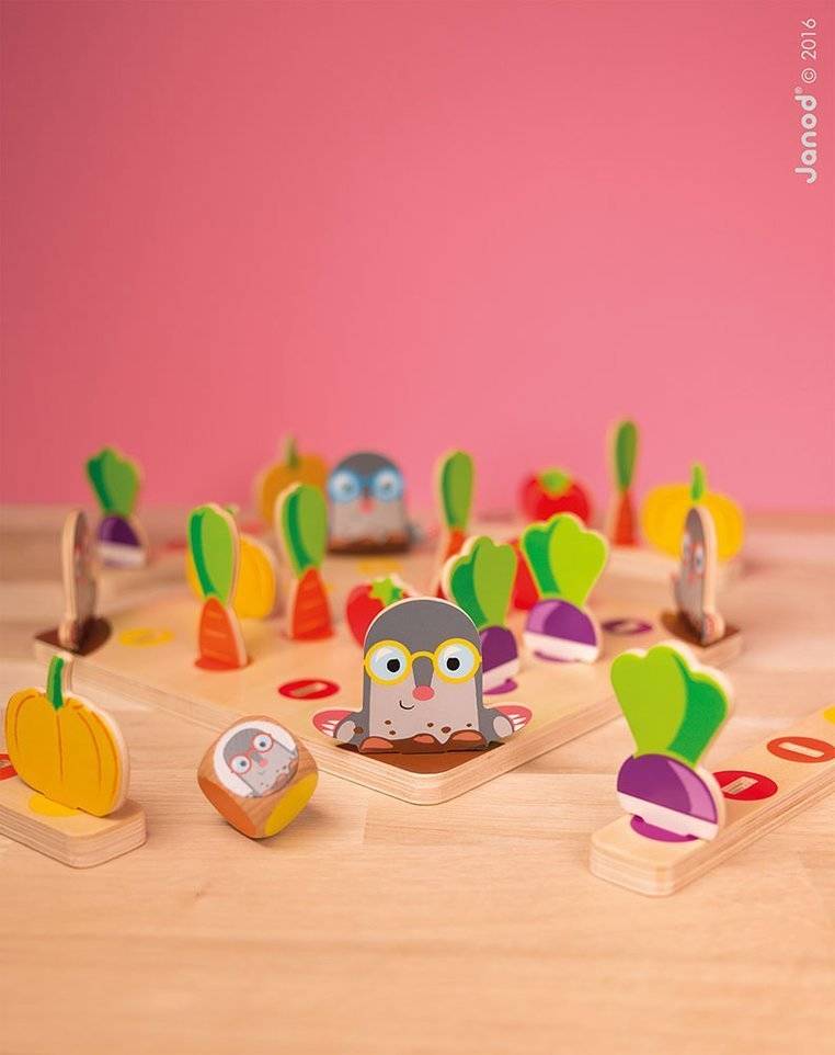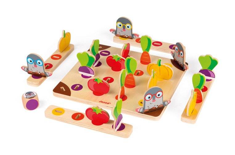Juego de carreras ¡Cuidado con el topo! La marca francesa JANOD es muy divertida para dos o cuatro personas, tanto niños como adultos. El set incluye una tabla de madera, posavasos y los elementos que se colocan sobre ellos, es decir, 4 moles y 4 trozos de verduras: nabos, tomates, zanahorias y calabazas, creando un pequeño huerto. Los jugadores asumen el papel de jardineros y tienen la tarea de recoger una cesta llena de cultivos, demostrar astucia y evitar los topos. El primer jugador que consiga una verdura de cada tipo gana.