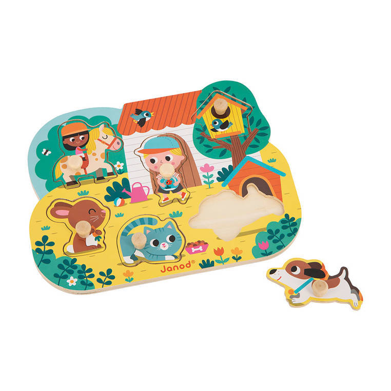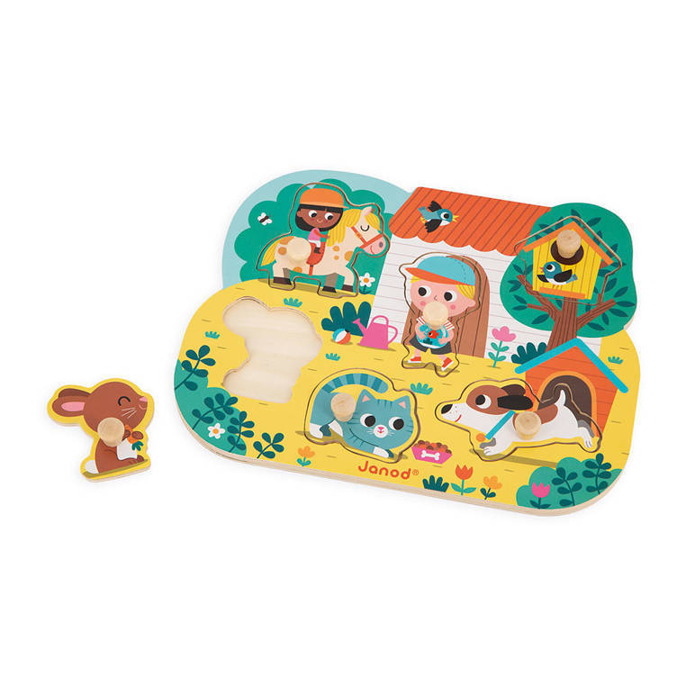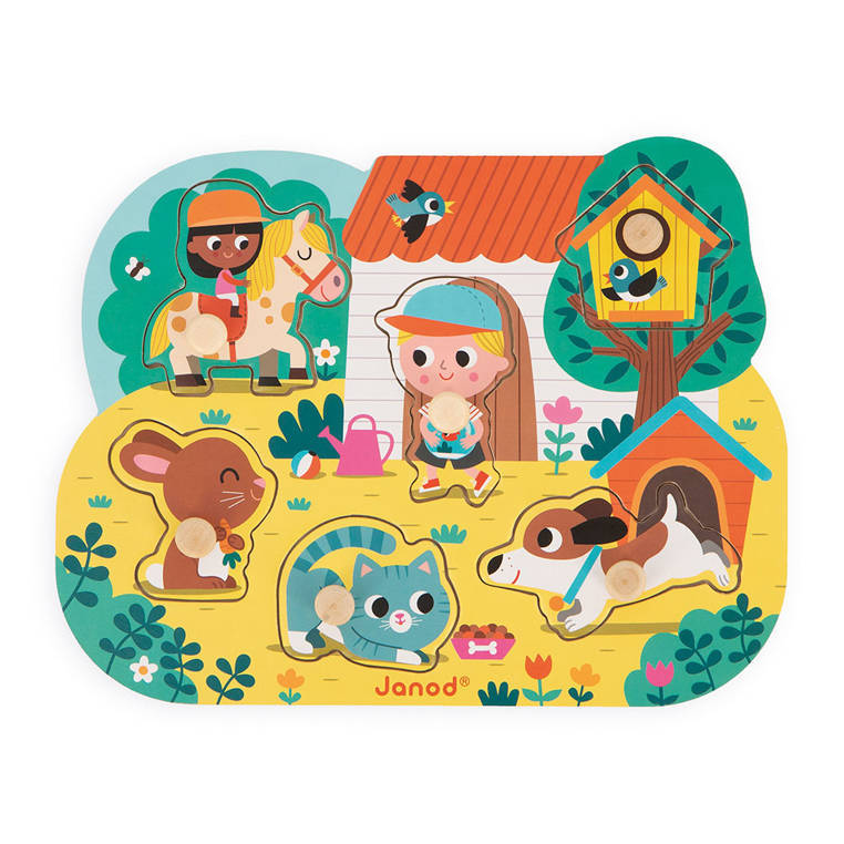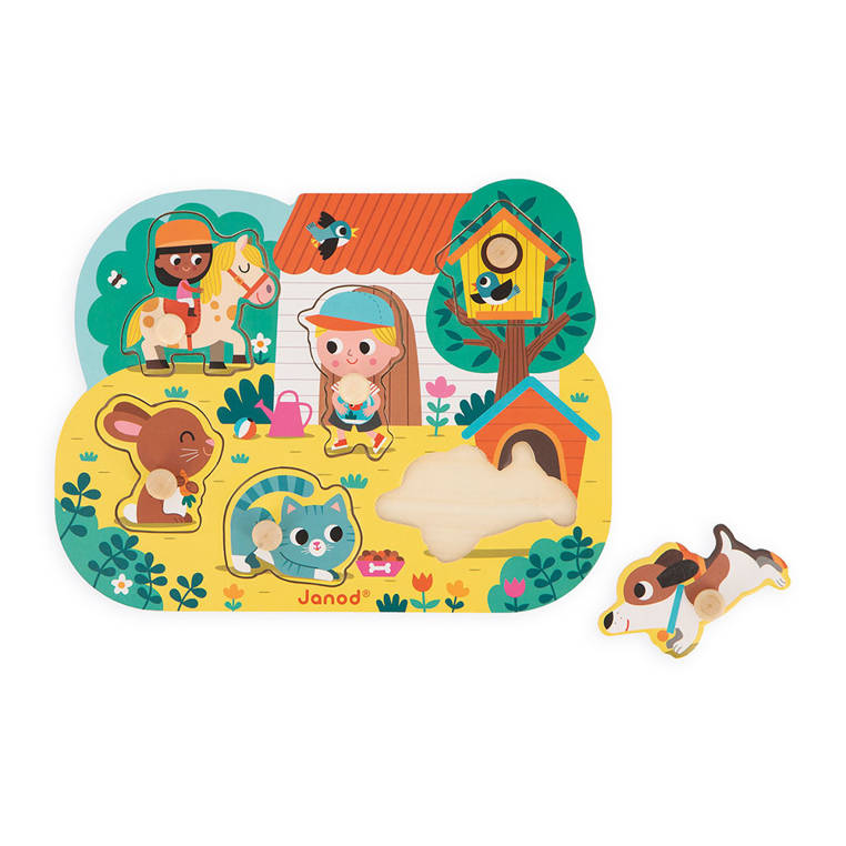 Rompecabezas de madera En el campo de la marca francesa JANOD es un excelente primer rompecabezas para niños pequeños. El conjunto consta de 7 elementos: 6 figuras de madera (una niña montada a caballo, un niño con un acuario, una pajarera, un perro, un gatito y un conejo) y 1 tabla de madera en un bosque rural (que incluye una casa, árboles y una caseta para perros) y con rebajes que tienen las formas de las figuras/cosas mencionadas. La tarea del niño es hacer coincidir los elementos con los lugares apropiados del tablero. Los mangos especiales en cada uno de ellos facilitan el juego para las manos pequeñas. Un rompecabezas así es la introducción perfecta a los rompecabezas reales.