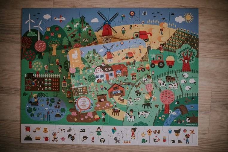 Rompecabezas de observación en una maleta La granja de la marca francesa JANOD consta de 24 prácticos elementos que, cuando se organizan, crean una hermosa imagen que muestra la granja con los edificios y su entorno: tierras de cultivo, estanque, huerto o molino. Además, en la parte inferior del rompecabezas, en la barra, se encuentran ilustraciones individuales que se encuentran en el rompecabezas terminado, p. un granjero, una cometa, un molino de viento, una colmena o un espantapájaros, lo que además hace más atractiva su disposición y entrena la percepción. Los rompecabezas están hechos de cartón duradero. Fueron diseñados y fabricados en Francia. Embalado en una maleta estética con asa. Perfecto para regalo.