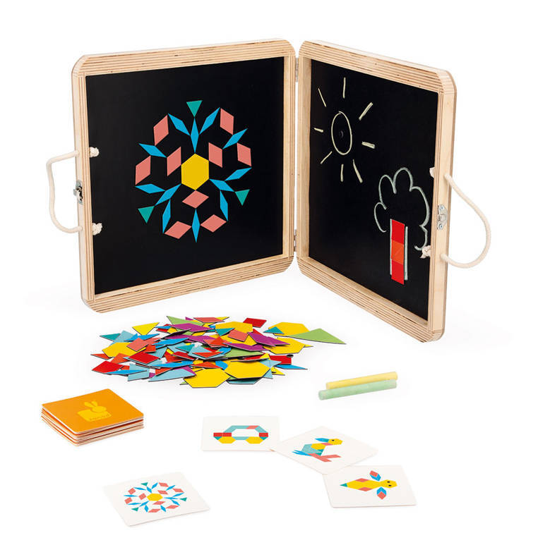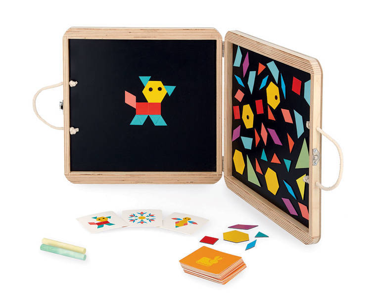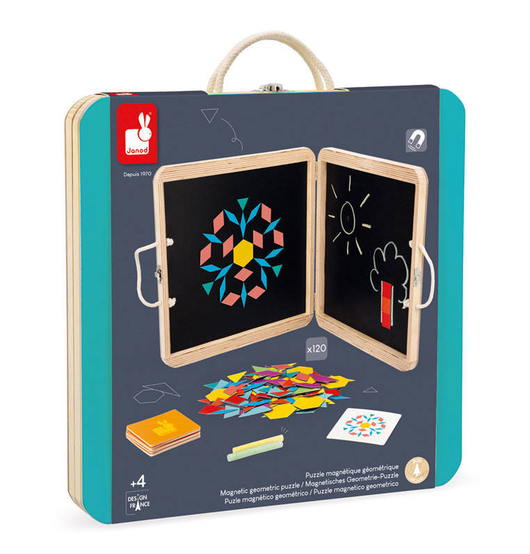 Un rompecabezas magnético en estuche de madera con la imagen de un gato francés de JANOD es un gran juguete que desarrolla la creatividad y la imaginación. El set incluye 120 imanes de formas geométricas y bonitos e intensos colores que un niño puede colocar en ambas paredes interiores de la maleta. Además contiene 20 tarjetas gráficas, incl. animales para representar en la pizarra y tiza, porque estas paredes interiores también pueden actuar como pizarra. El juguete le servirá al niño durante mucho tiempo y no se aburrirá pronto, porque ofrece muchas posibilidades creativas. Está bellamente elaborado, lo que despierta el sentido artístico y también entrena la percepción y la destreza manual del niño. Es un gran entretenimiento para los pequeños constructores y para todos los niños creativos.