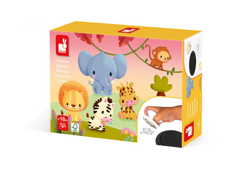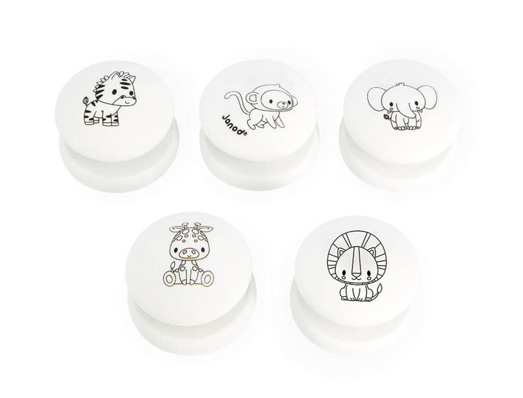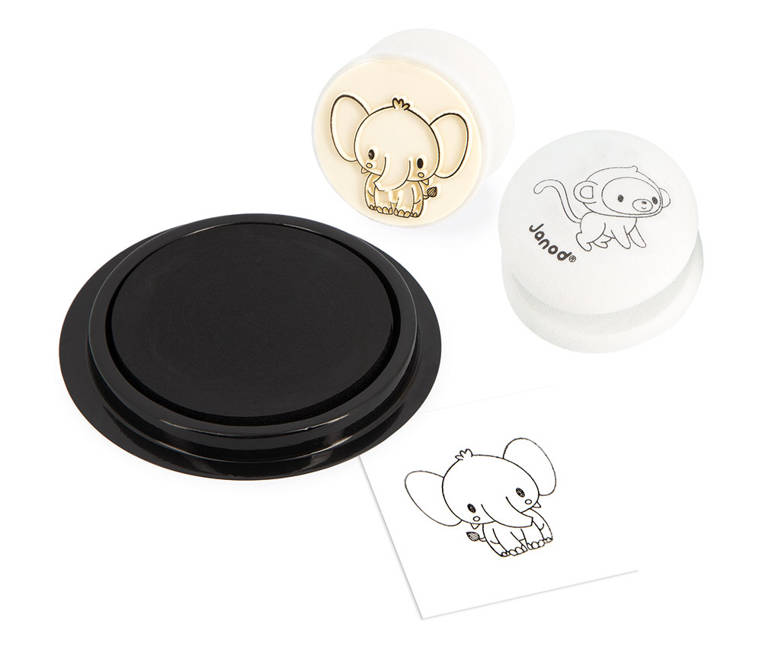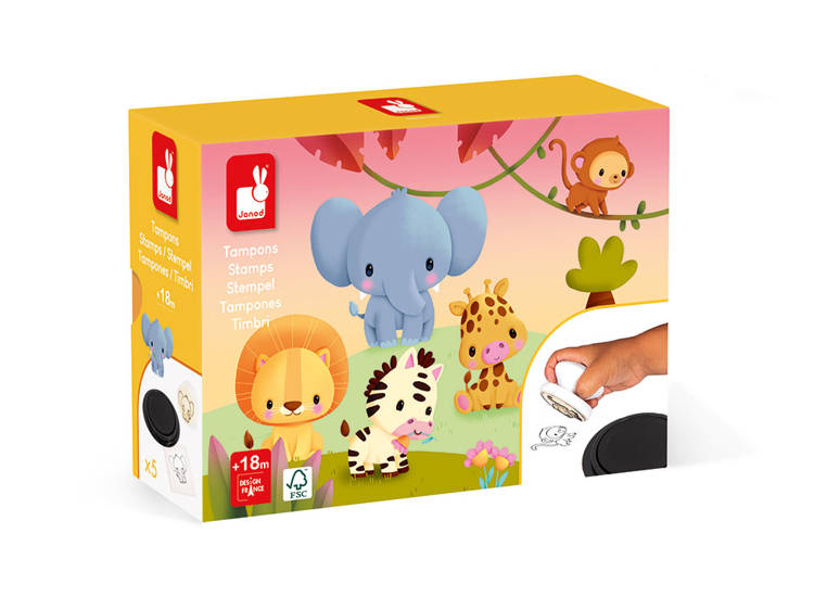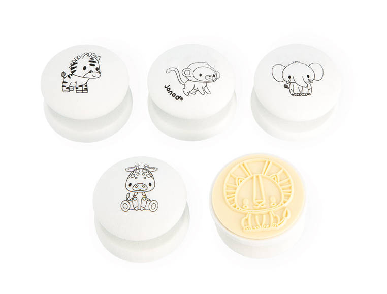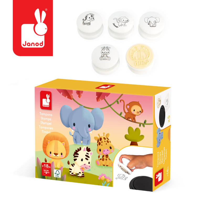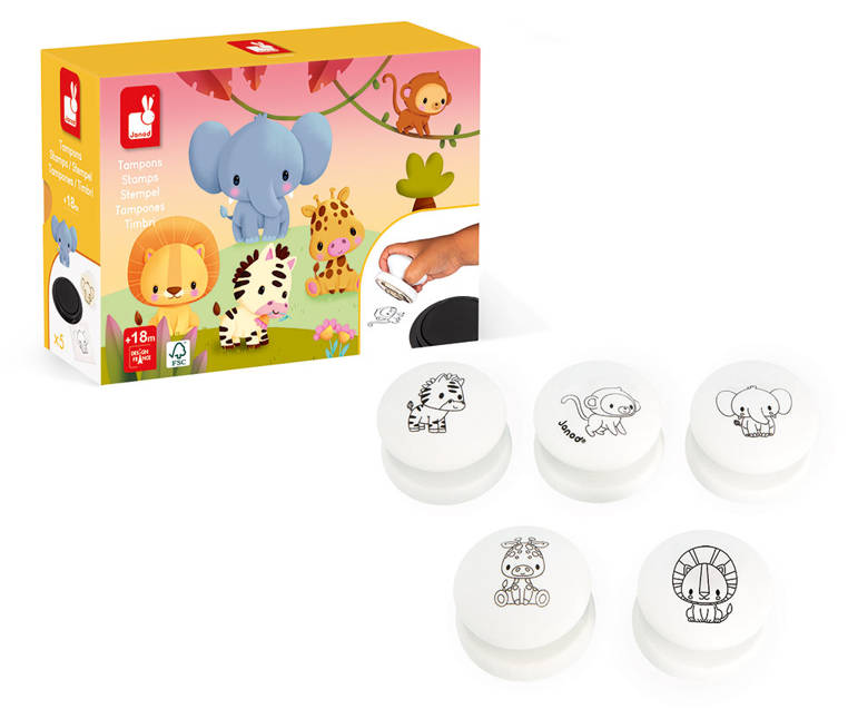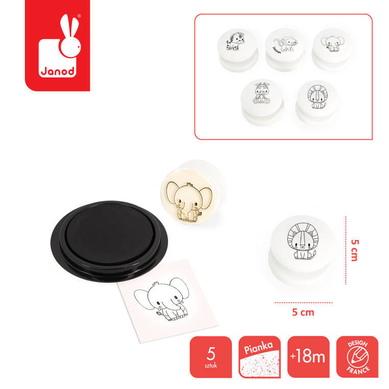 El creativo set de sellos Savanna de la marca francesa JANOD incluye 5 prácticos sellos de gran tamaño con lindos gráficos: cebra, mono, elefante, jirafa y león. Con su ayuda, puede decorar superficies seleccionadas, crear historias interesantes o imágenes reflejadas en color. Los portasellos redondos blancos están hechos de madera y tienen unas agradables formas redondeadas. El set también incluye un cojín de tinta negra. Estampar es una diversión muy larga, atractiva y tranquilizadora para un niño. El conjunto fue diseñado en Francia. Está embalado en una estética caja de cartón. Perfecto para regalo.