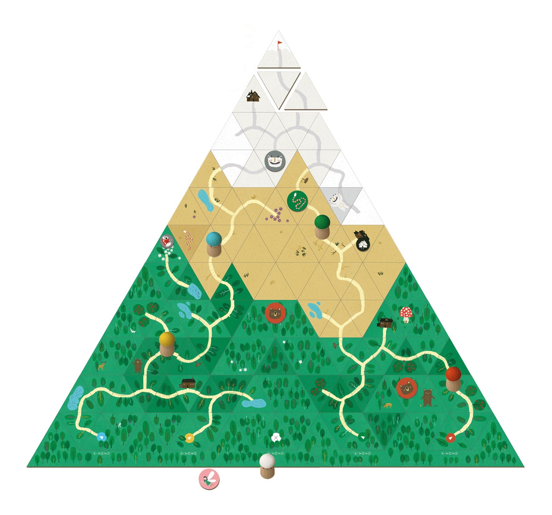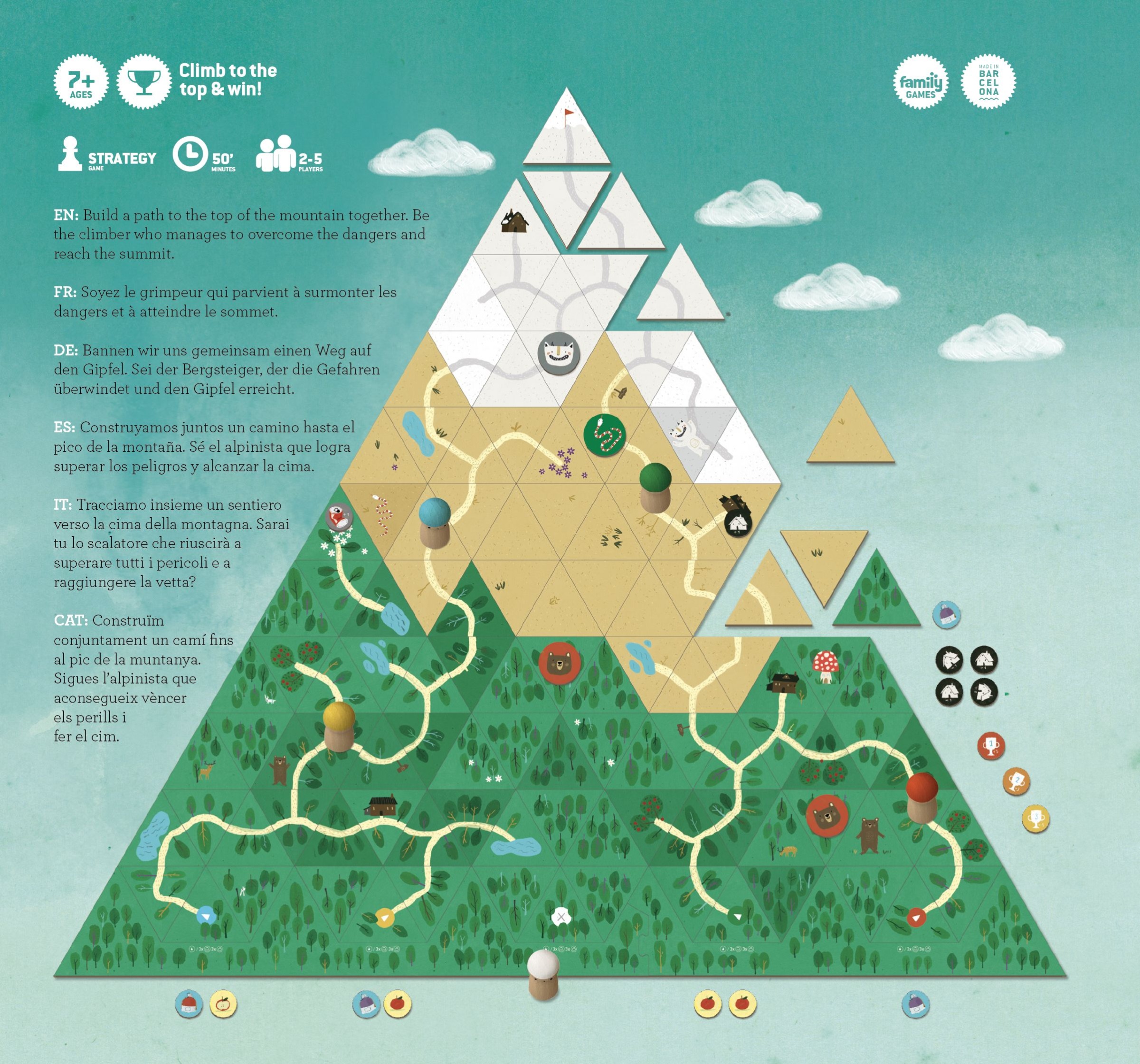 La apertura de caminos que llevan a la cima es un objetivo común y todas las jugadoras podrán utilizarlos, pero sólo una de ellas llegará primero a la cima gracias a una buena estrategia, una correcta gestión de los recursos y el azar del dado.