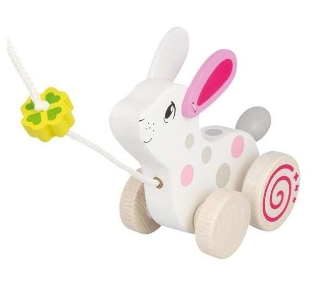 Con una hoja de trébol apetitosa frente a su nariz, el encantador conejo de madera está listo para seguir a su benefactor ávidamente en cada paso del camino. El diseño moderno debería atraer la atención de muchos niños.