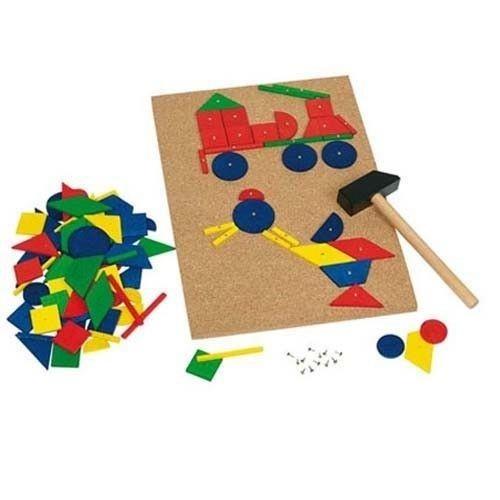 El set contiene 102 piezas para crear formas con figuras coloridas. Usando un martillo, deben ser clavadas en la tabla de corcho, y surgirán imágenes según tu imaginación.