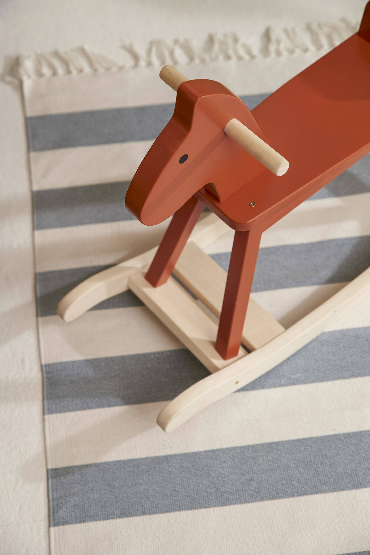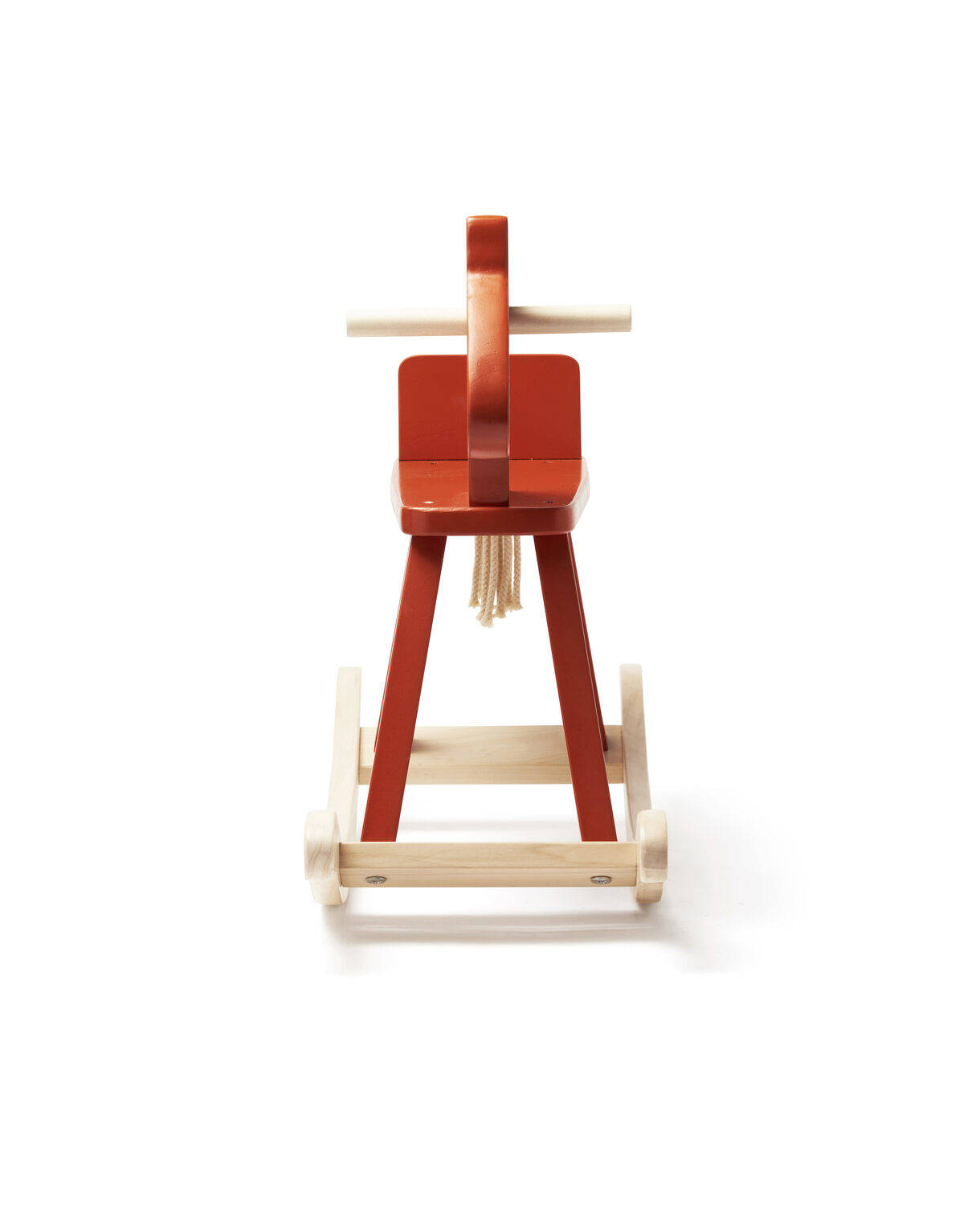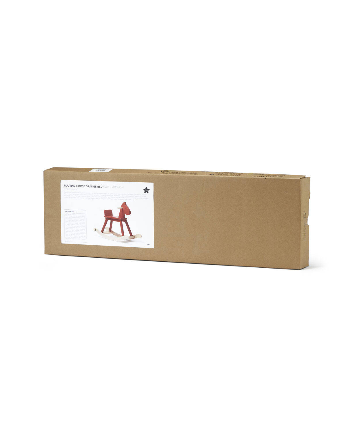 Un caballito de nuestra colección Carl Larsson en madera certificada FSC. Dispone de asas resistentes y rieles antivuelco. Un caballito de madera clásico pero moderno con muchas conexiones con la forma de diseñar de Karin. Modernista y sencillo con un toque diferente. El método de anudar la cola en la parte posterior justo a través de un agujero se inspiró en los numerosos textiles que Karin tenía en su casa en Suecia. A menudo agregaba pompones y flecos en los manteles de manera similar. La sección transversal cuadrada de las patas y el color mismo están inspirados en la mecedora modernista de Karin. Muchos de los muebles del comedor tienen este fantástico tono rojo anaranjado.