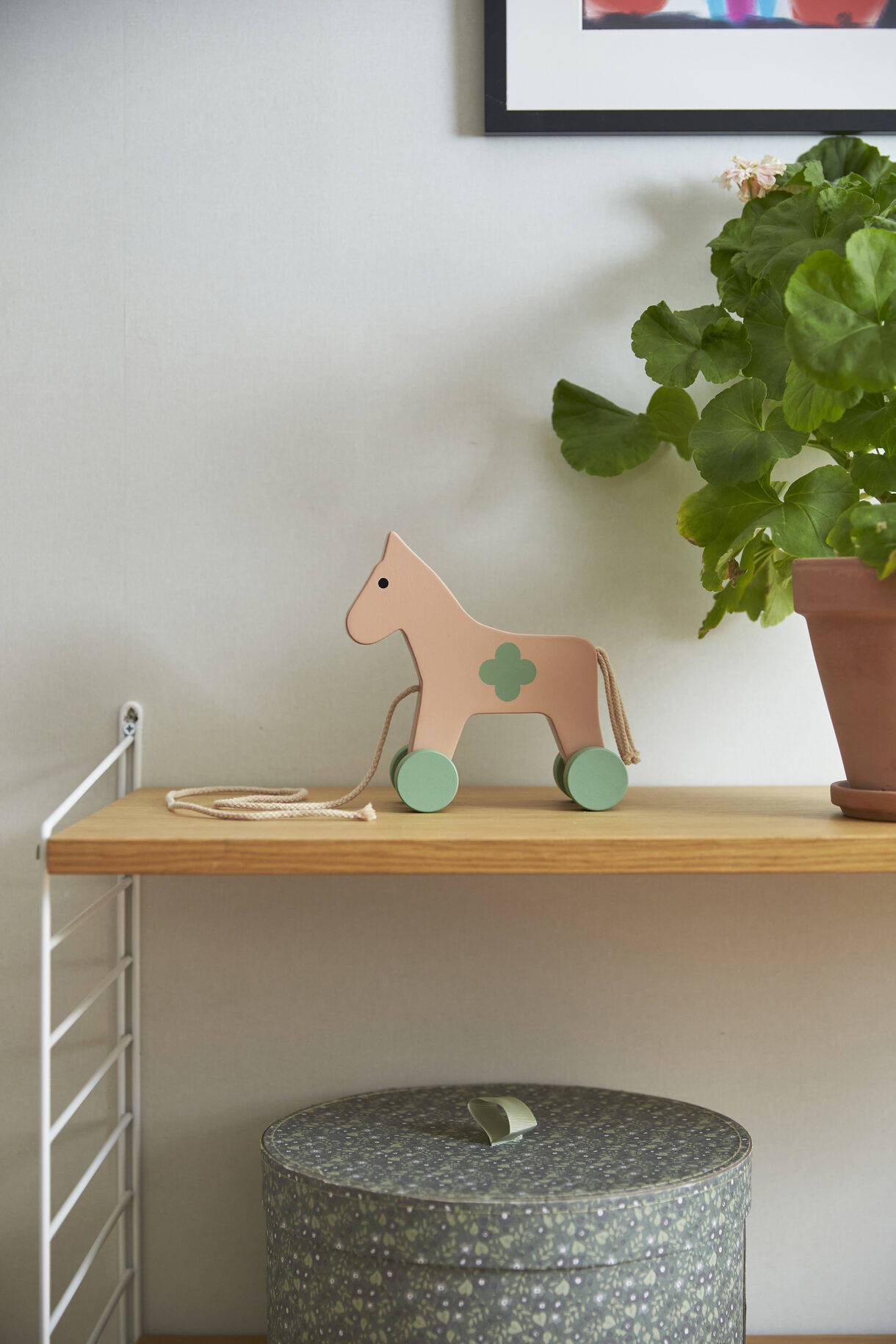 Un caballo de juguete de madera de la colección Carl Larsson con una cuerda para tirar de 60 cm. En casa de Karin y Carl hay una fantástica habitación llamada “el salón” con esta combinación de colores. Un pálido combinado con un verde fresco, comúnmente usado en Inglaterra alrededor de 1890. Karin se inspiró en su hermana, que vivía en Londres en ese momento. La habitación tiene rayas simples y muebles blancos combinados con muebles antiguos y barrocos: ¡una mezcla de todo de una manera encantadora! El patrón en el costado del caballo está inspirado en los murales pintados en forma de trébol de cuatro hojas de la casa. Certificado FSC.