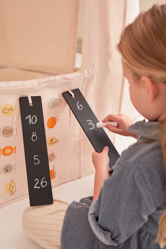 ¿Quieres administrar un restaurante o un estudio de yoga? ¿Quizás prefieras vender verduras o ropa resistente? Sólo la imaginación puede detener al pequeño emprendedor con este juego complementario. Fácil de agregar a nuestra casa de juegos o carpa pabellón para un juego aún más creativo. Enrolle la tela de la tienda existente y agregue las piezas en el paquete. Elige entre los menús incluidos y adjúntalos a las pizarras. ¡Voilá! La tienda se convierte en restaurante o cafetería. El paquete contiene menús para un restaurante/cafetería, una tienda, una frutería y un spa. El tejido combina con nuestras tiendas de campaña en color blanco roto.