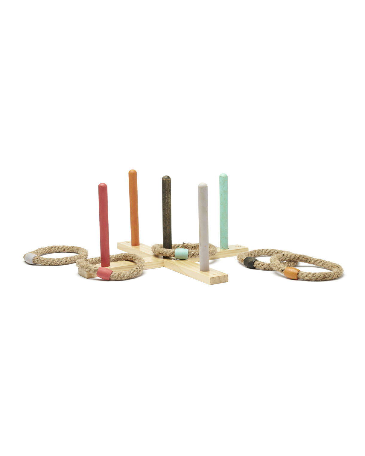 Juego tradicional de lanzamiento de aros en madera, apto para niños de tres años en adelante.