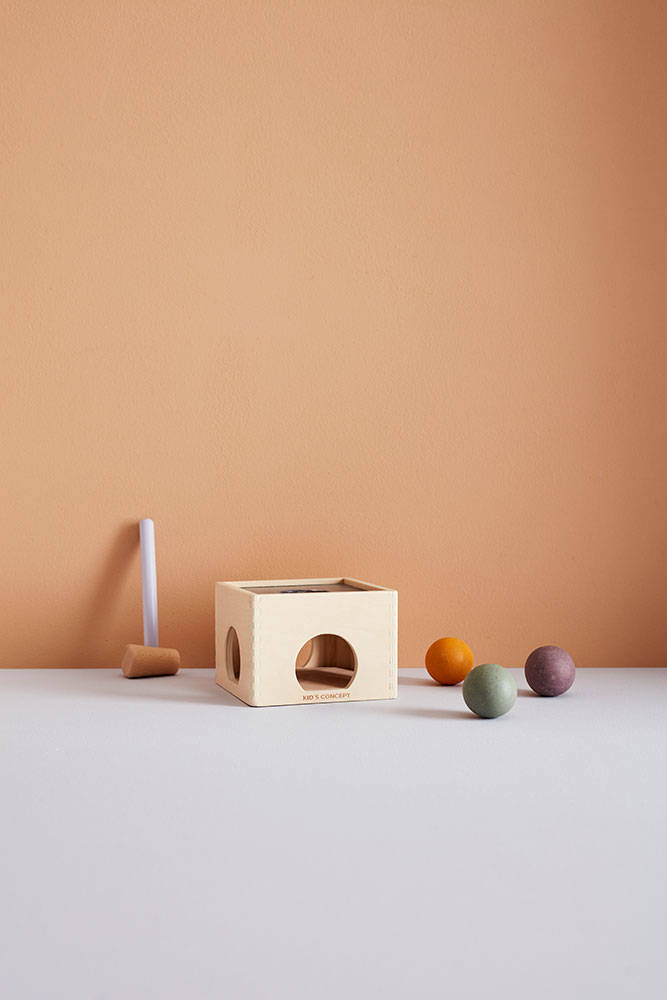 Material: Caja con agujeros: contrachapado de tilo, haya, ABS . Martillo: haya. Bola: esquima.