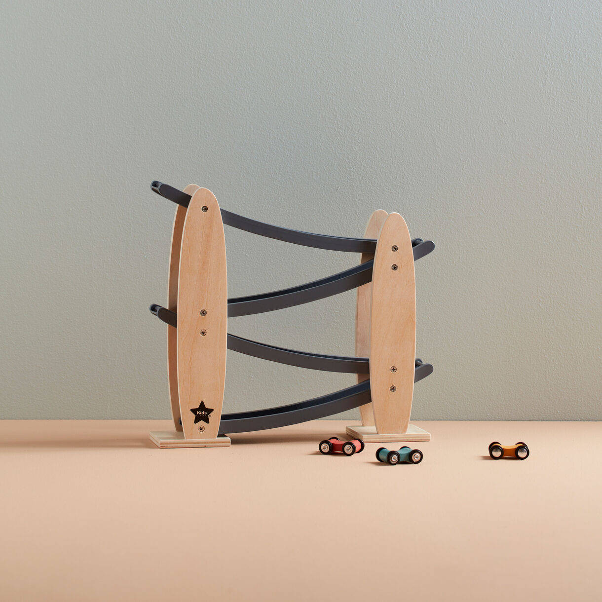 Pista de coches: Contrachapado de tilo. Coches: Abedul. Eje: Aluminio.