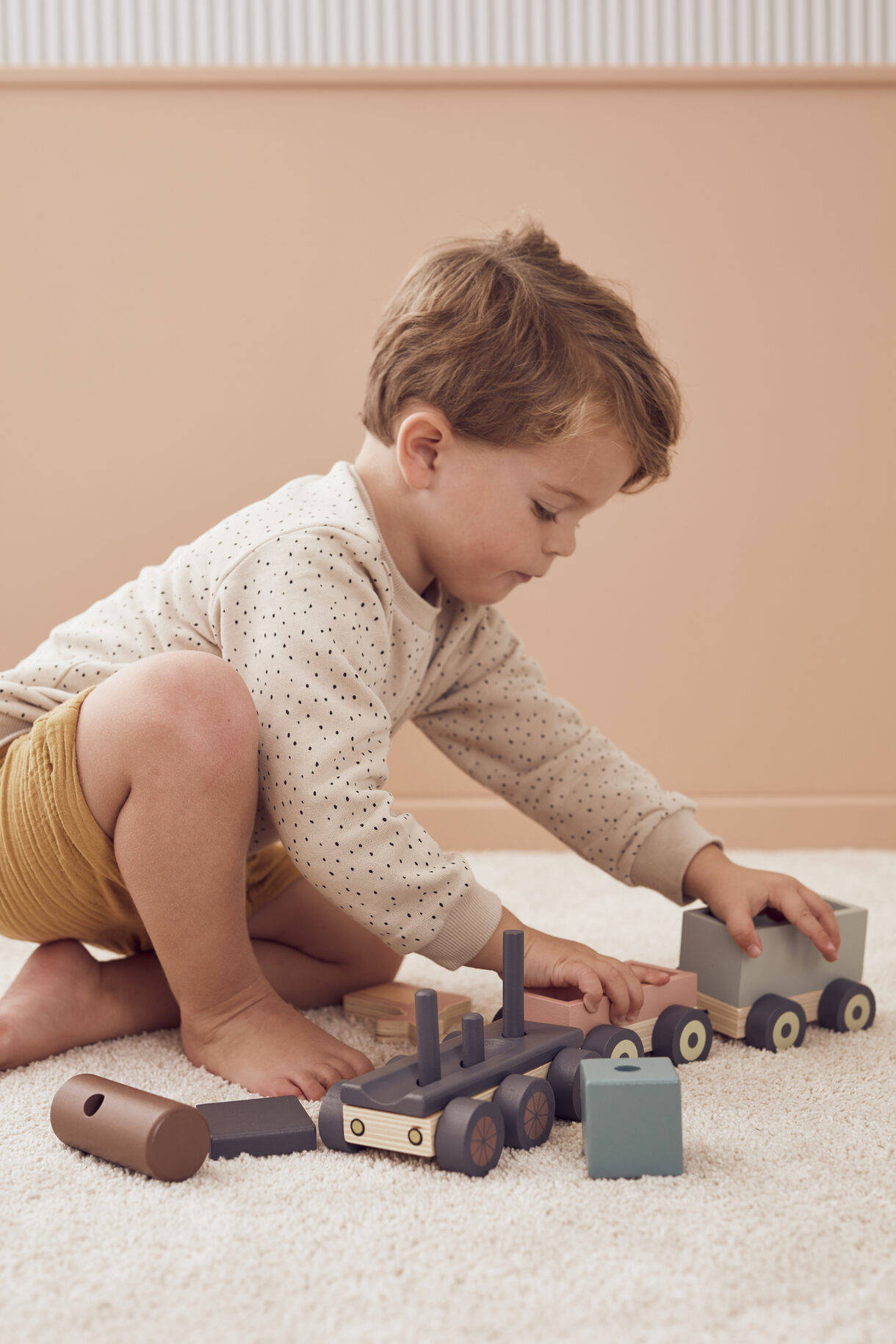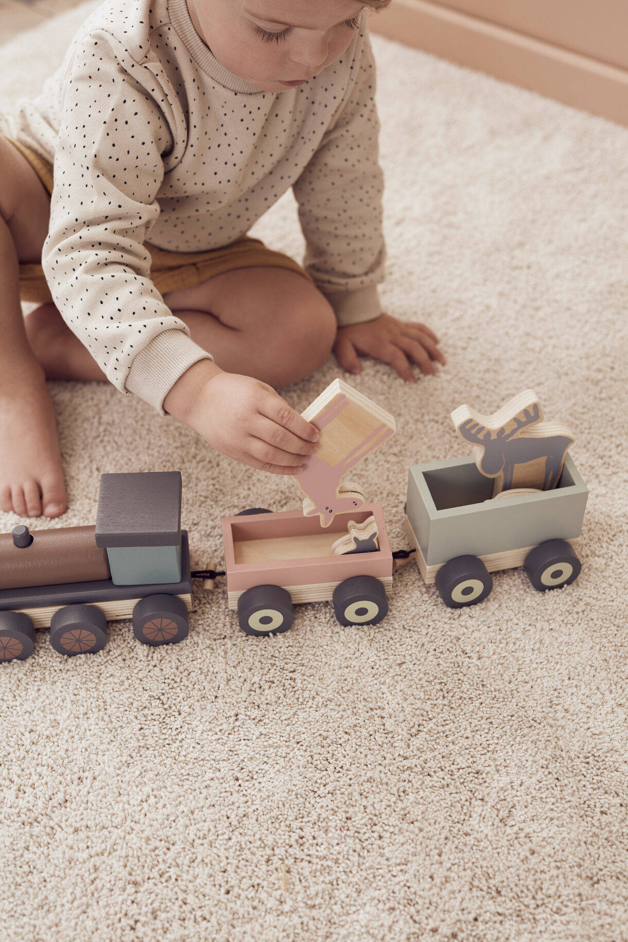 Tren de madera con locomotora hecha de bloques y dos vagones que se pueden conectar y desconectar fácilmente.