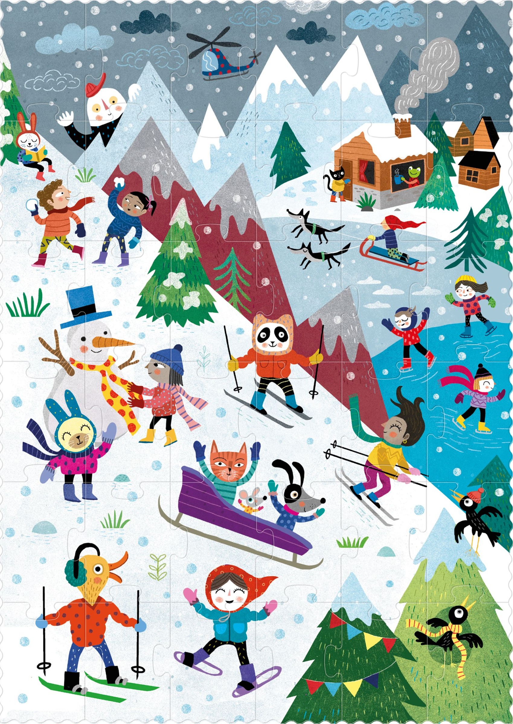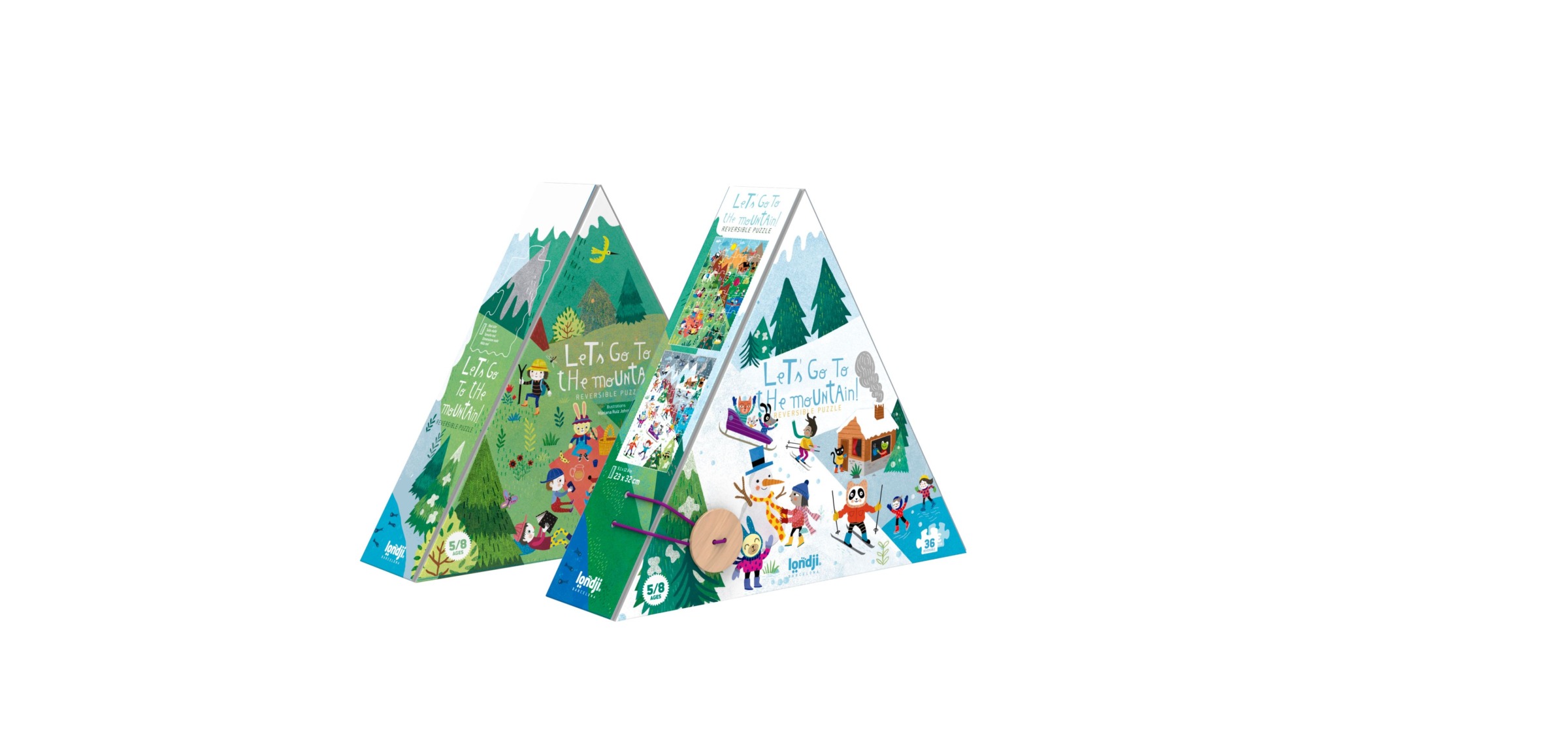 Un puzzle reversible de 36 piezas. En una cara nos deslizaremos por la montaña helada en invierno, en la otra nos zambulliremos en los meses de verano.