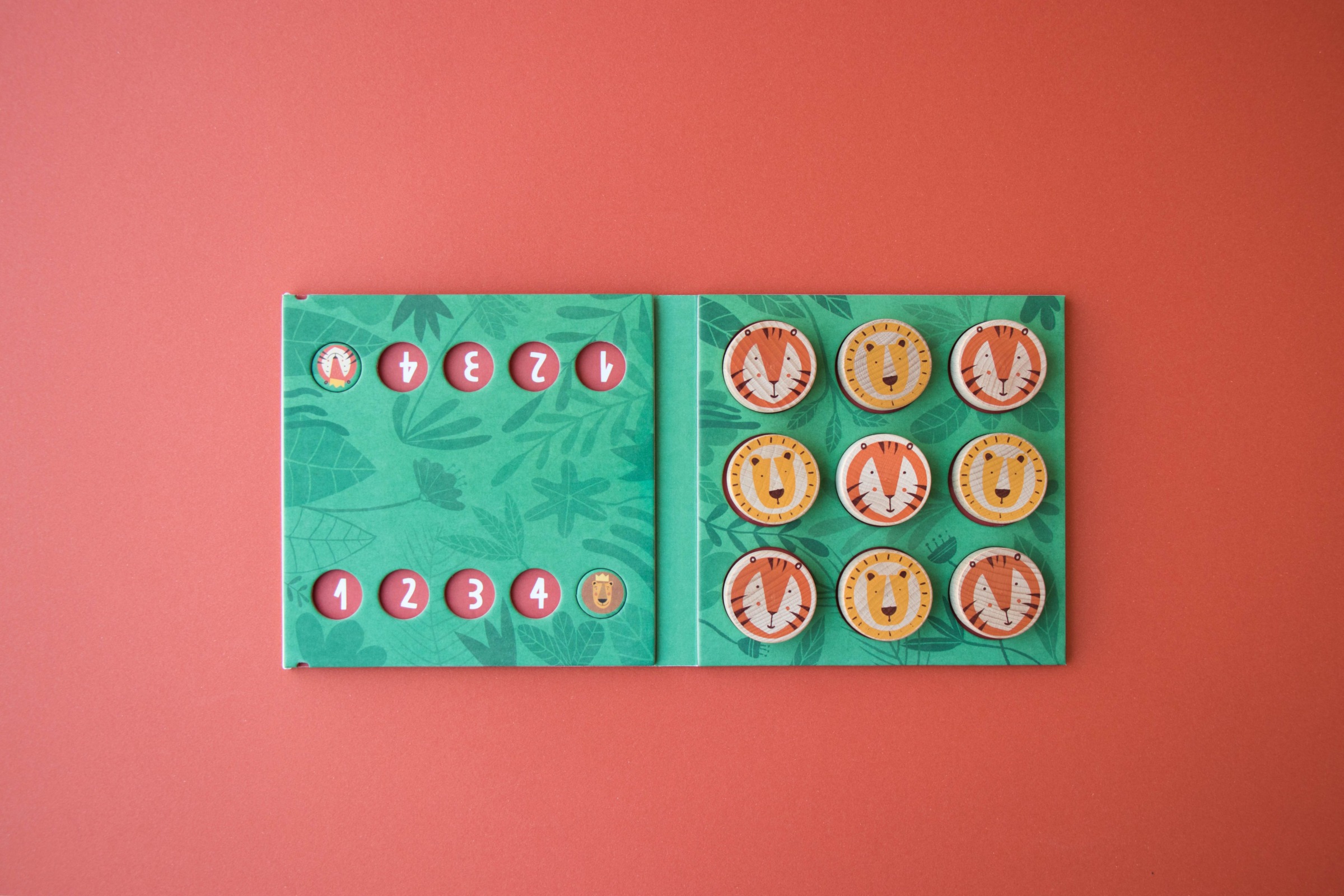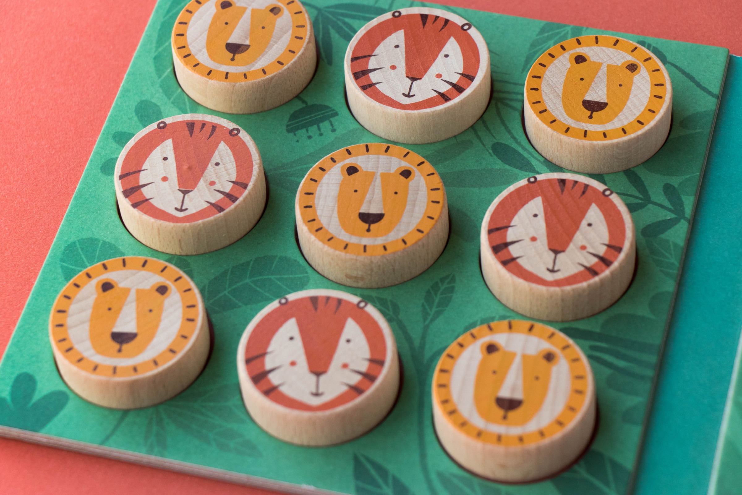 Un juego de 3 en raya tradicional de tigres y leones. Incluye 9 piezas de madera de haya de bosques sostenibles y un tablero de cartón reciclado.