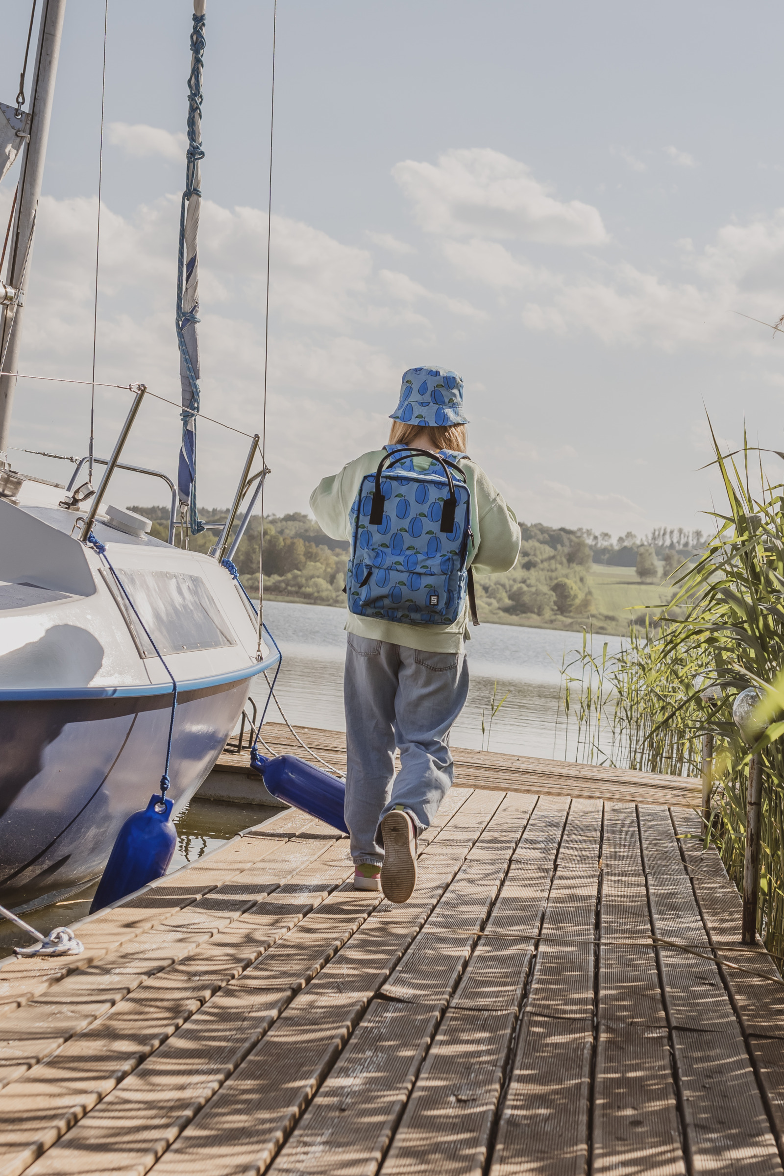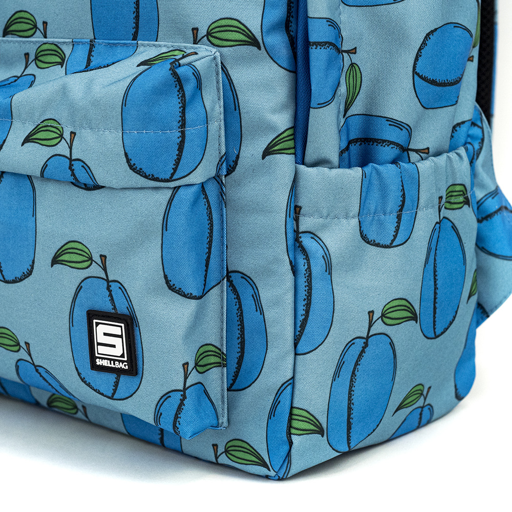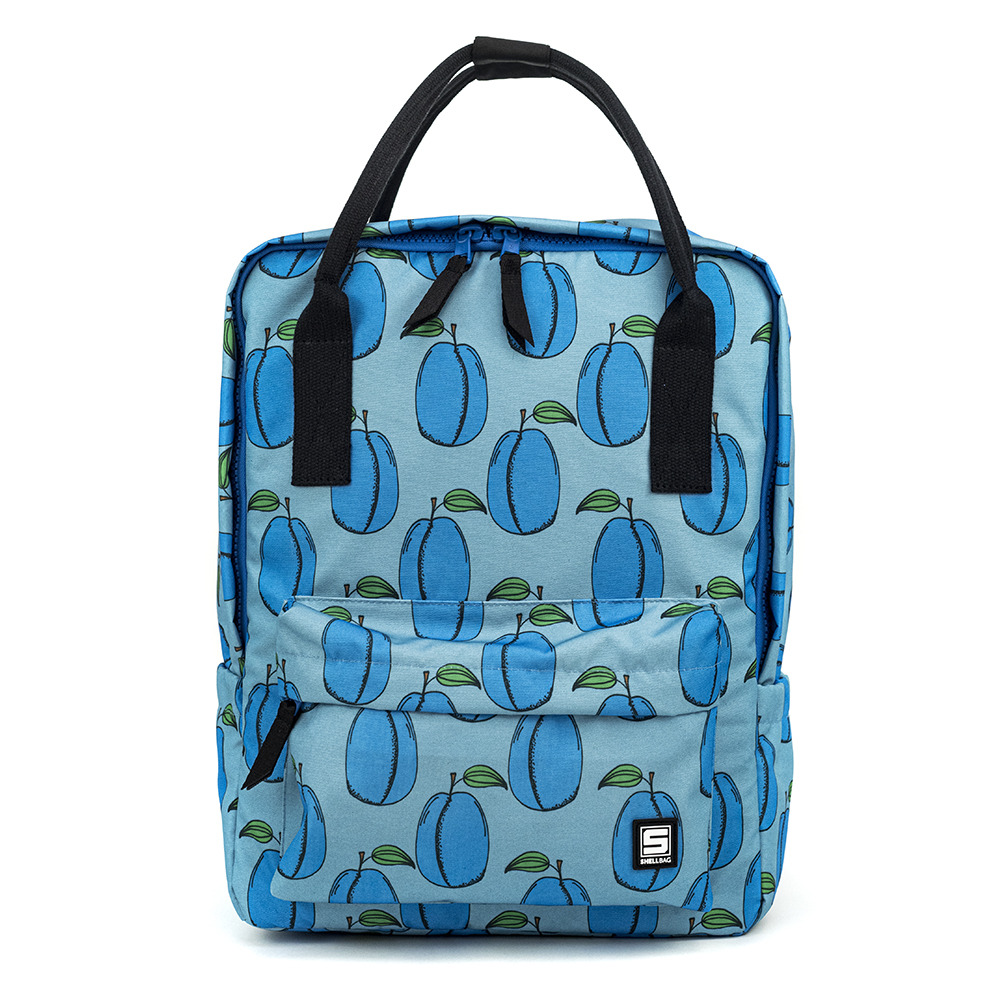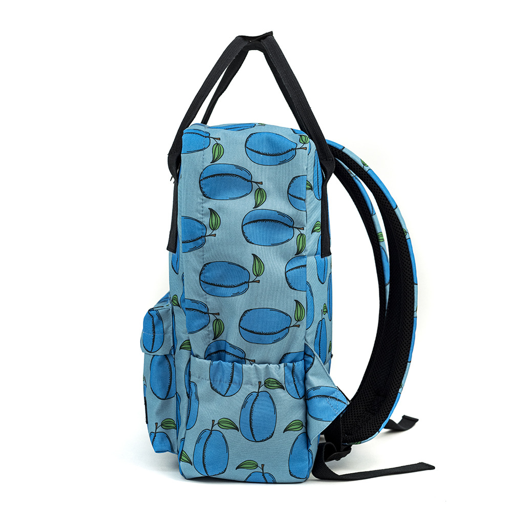 Elegante mochila urbana con estampado de ciruelas.