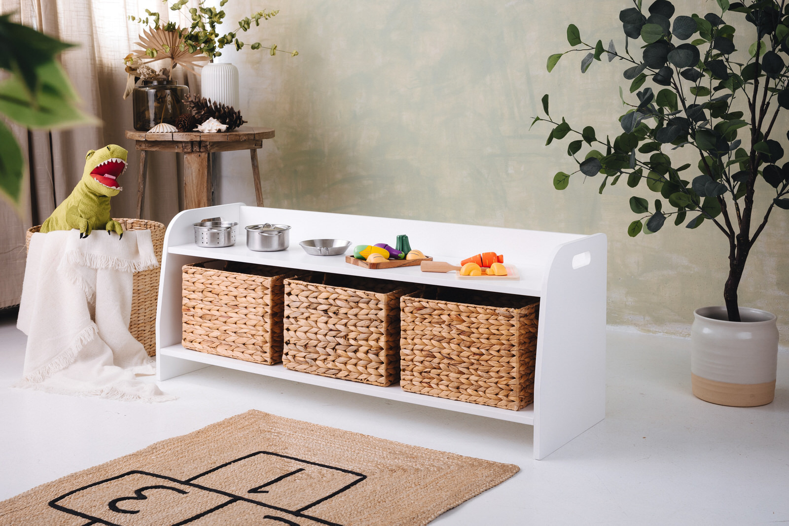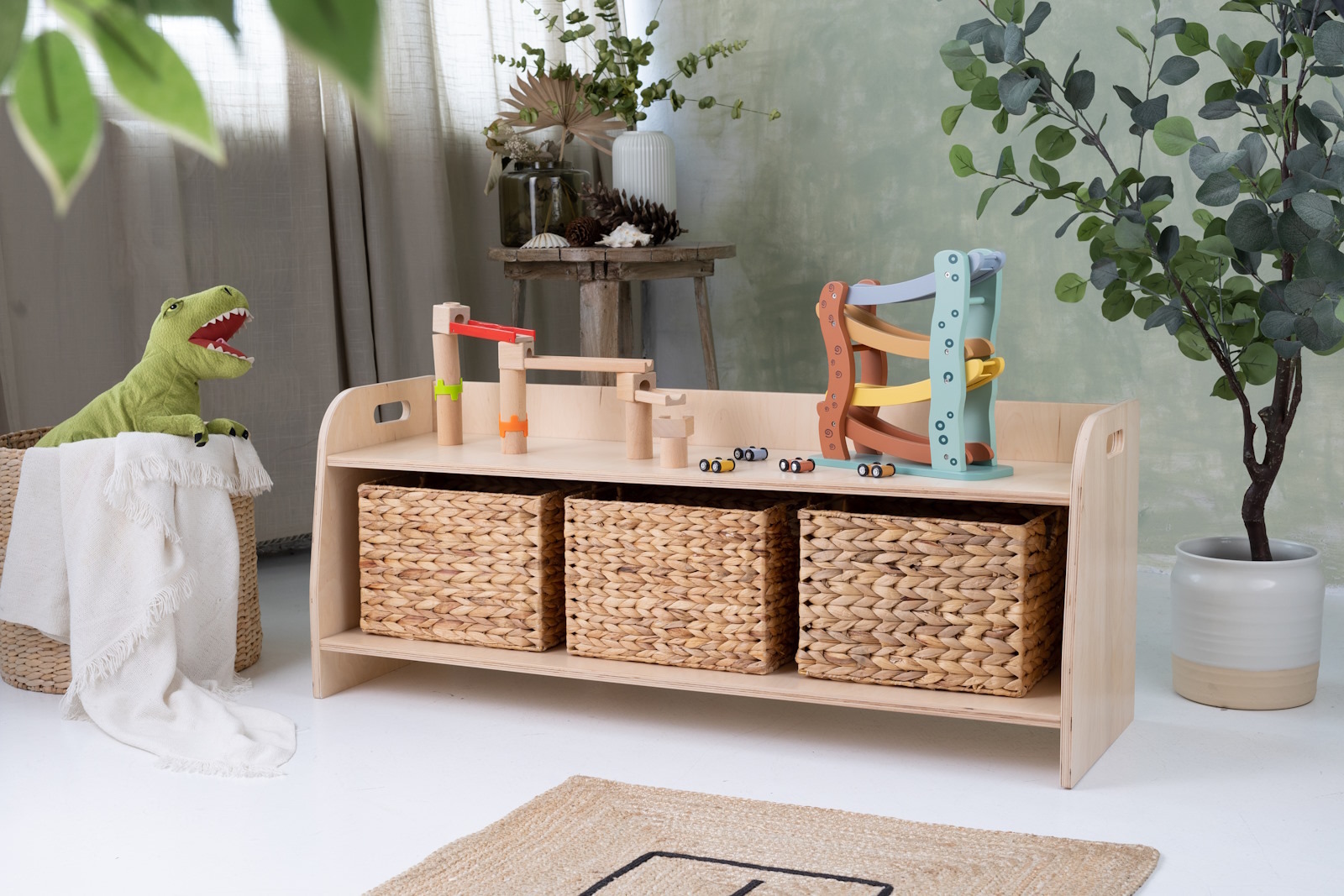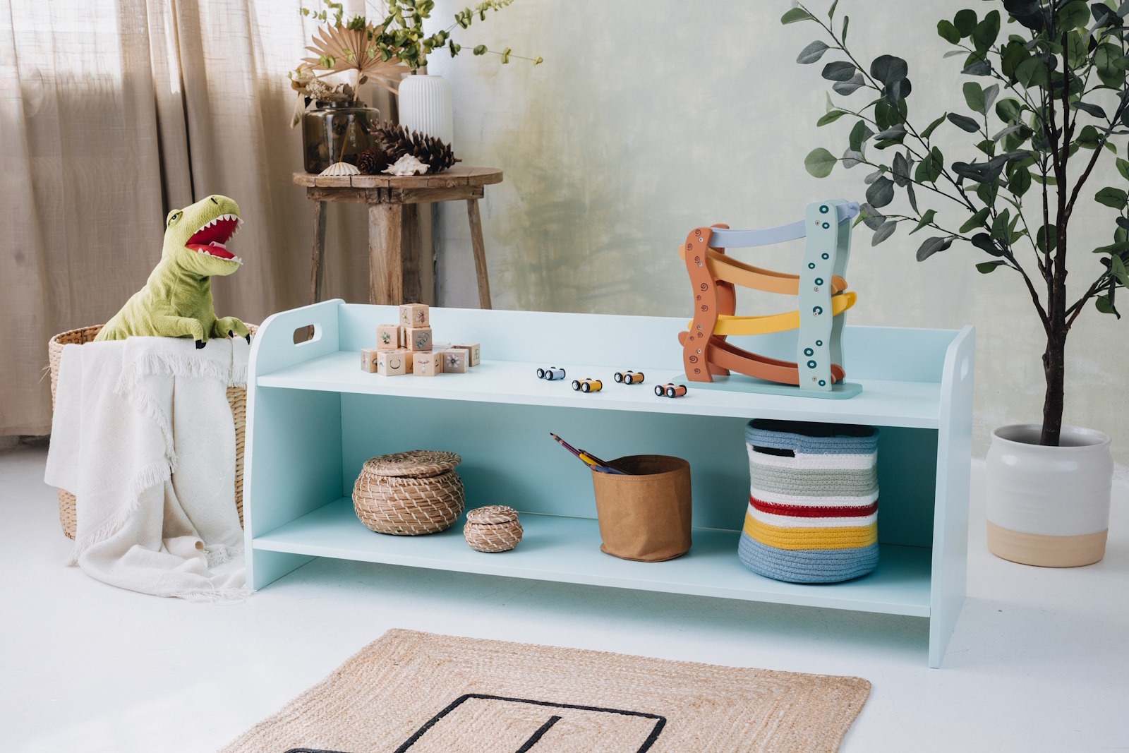 La estantería de juguetes tiene dos estantes a los que el niño tiene acceso ilimitado. El mueble se apoya directamente en el suelo y mide solo 44 cm de altura.