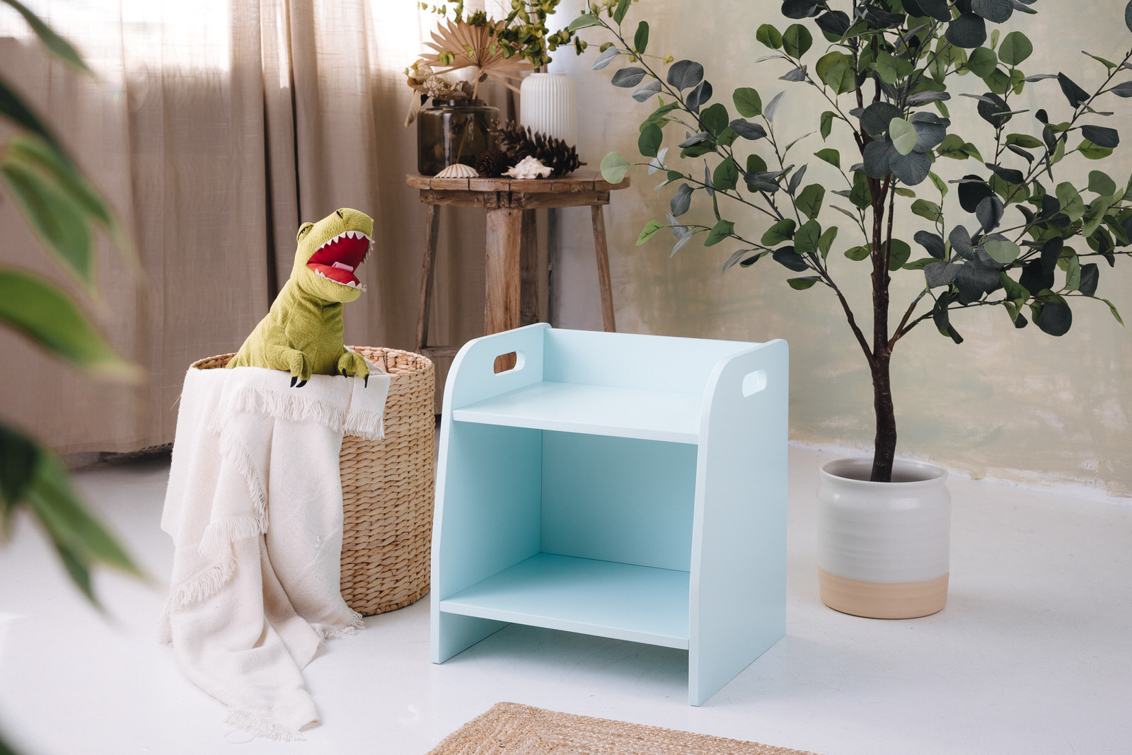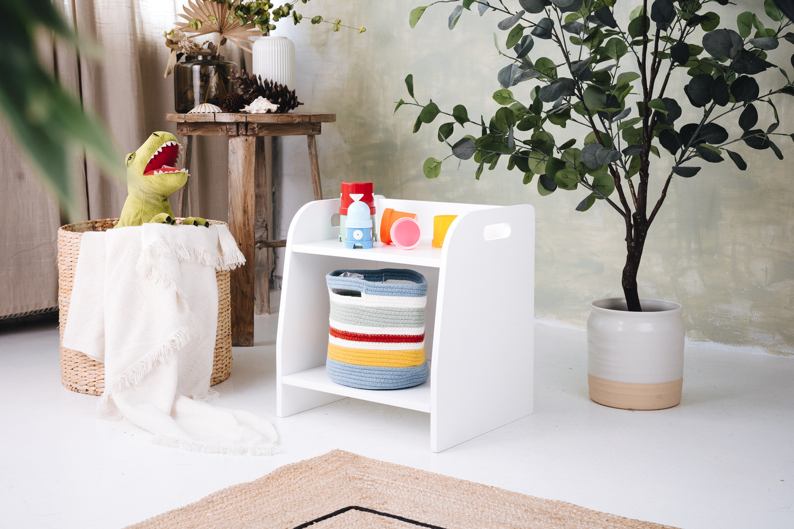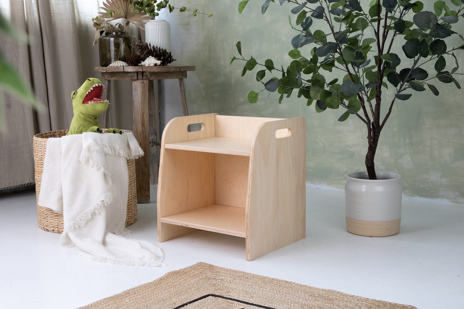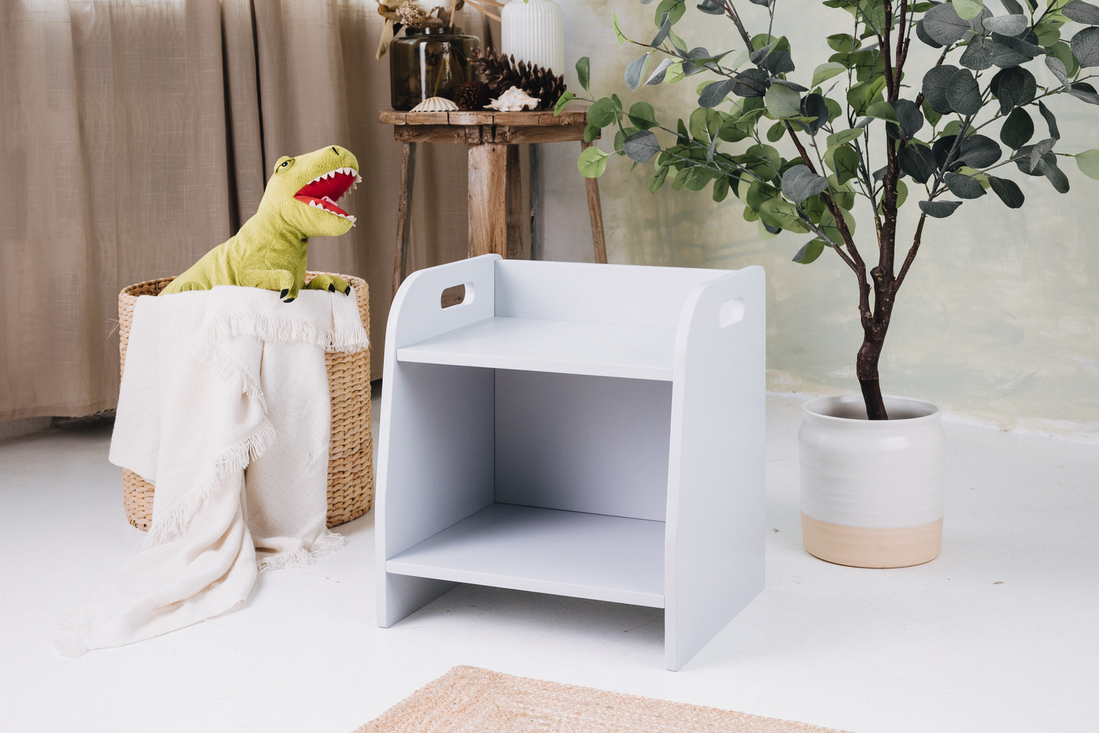 La estantería de juguetes tiene dos estantes a los que el niño tiene acceso ilimitado. El mueble se apoya directamente en el suelo y mide solo 44 cm de altura.