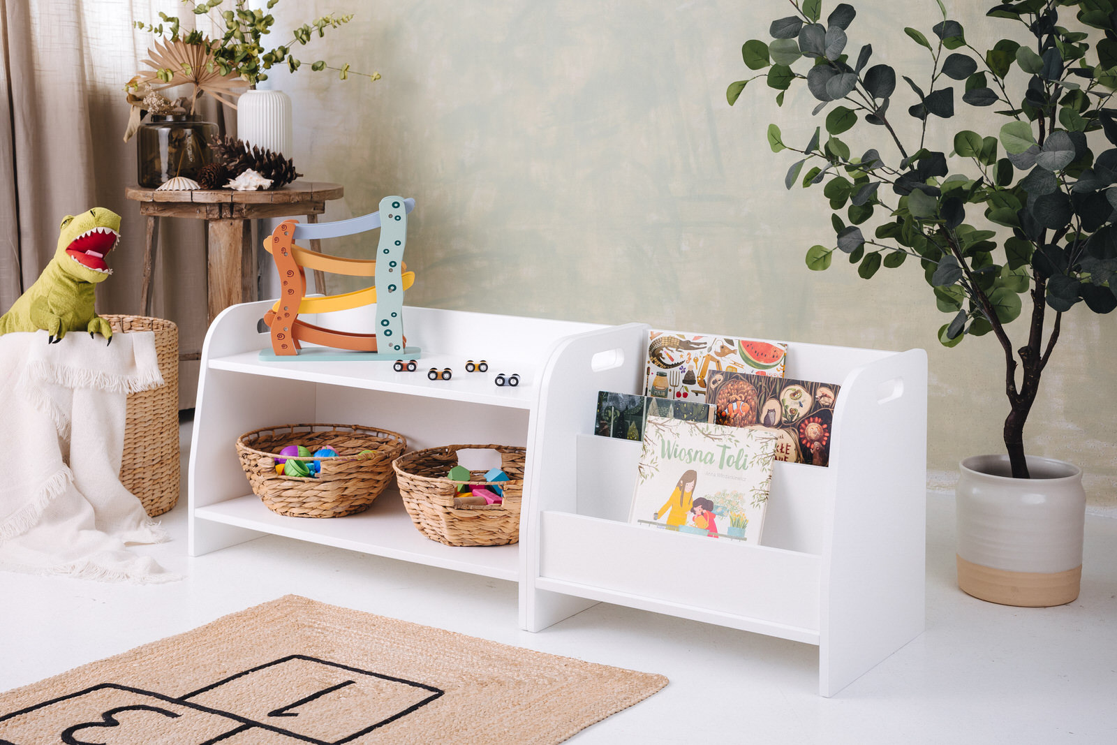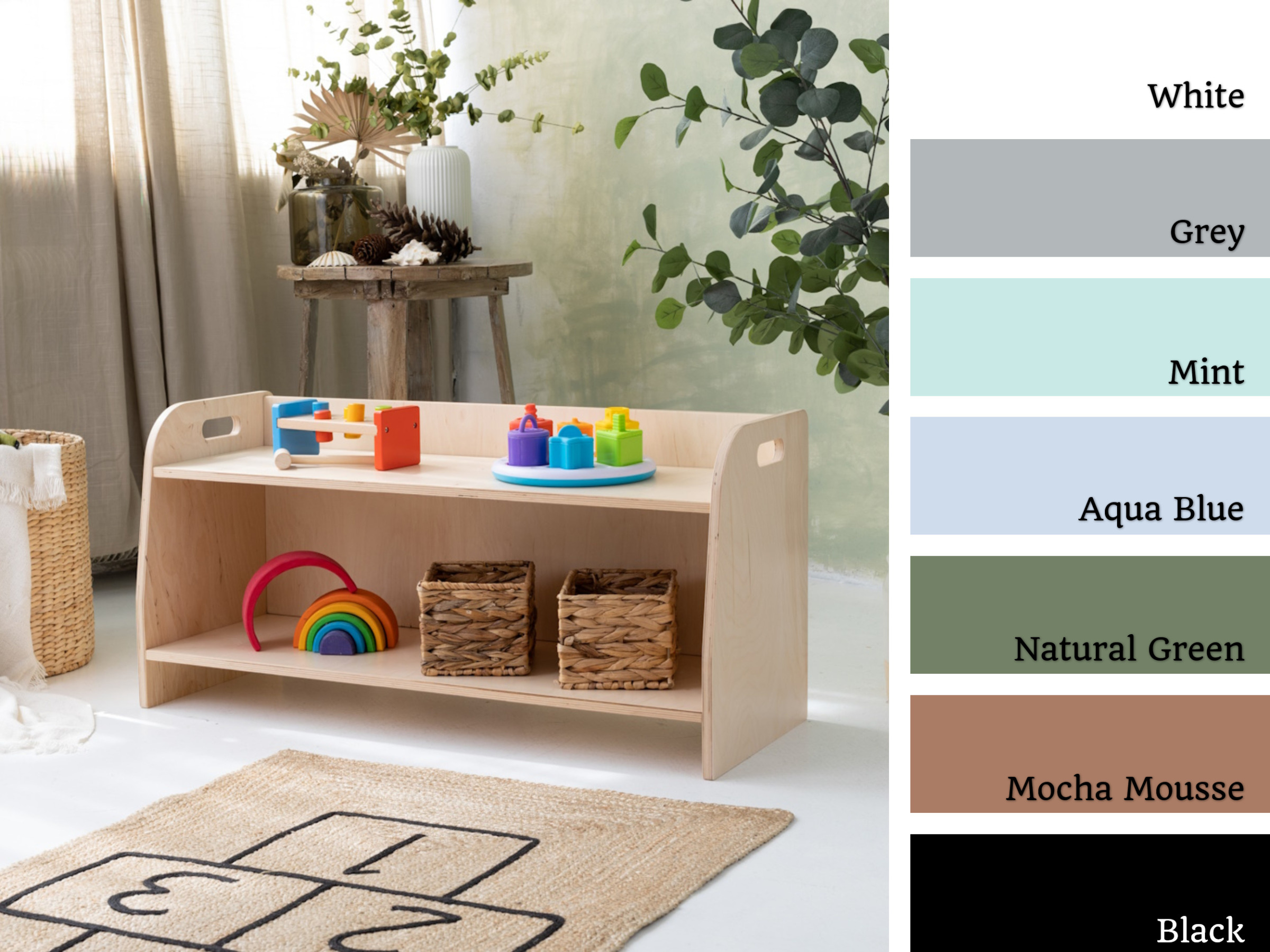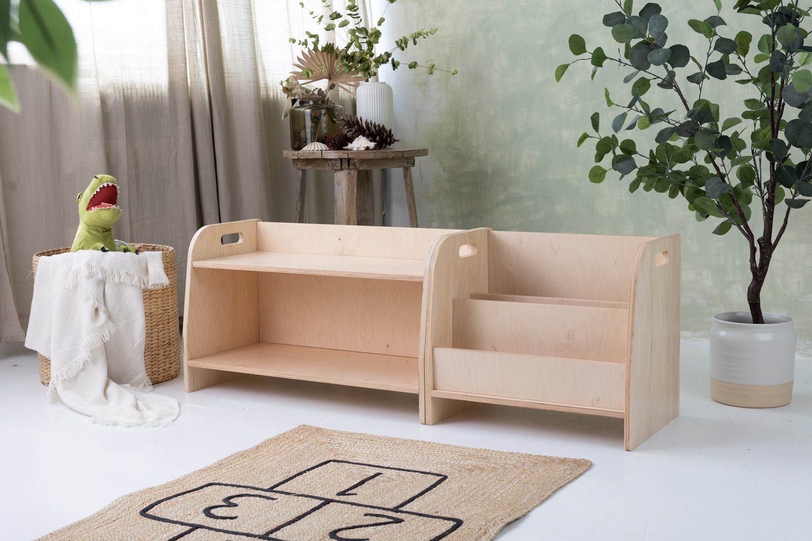 La estantería de juguetes tiene dos estantes a los que el niño tiene acceso ilimitado. El mueble se apoya directamente en el suelo y mide solo 44 cm de altura.