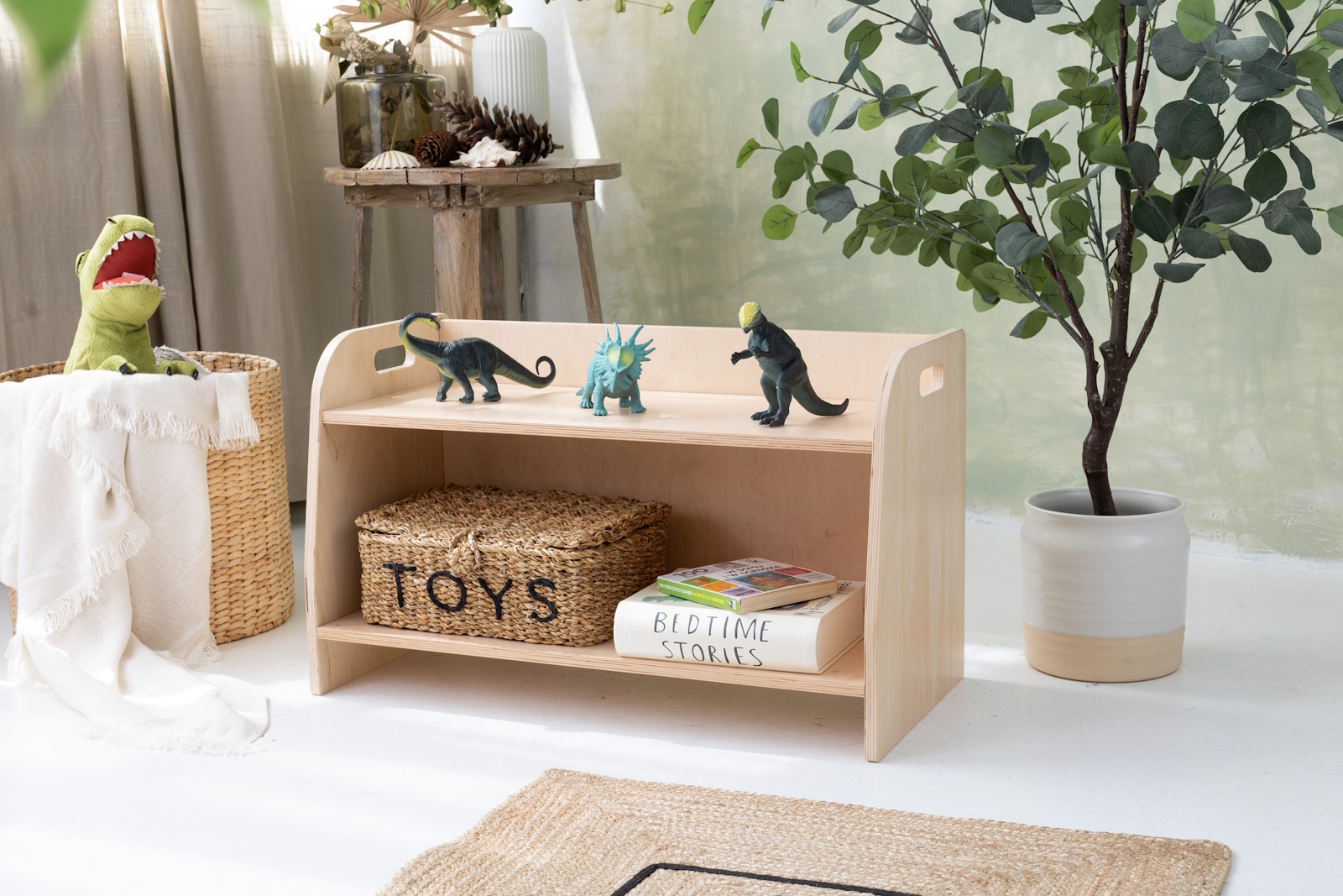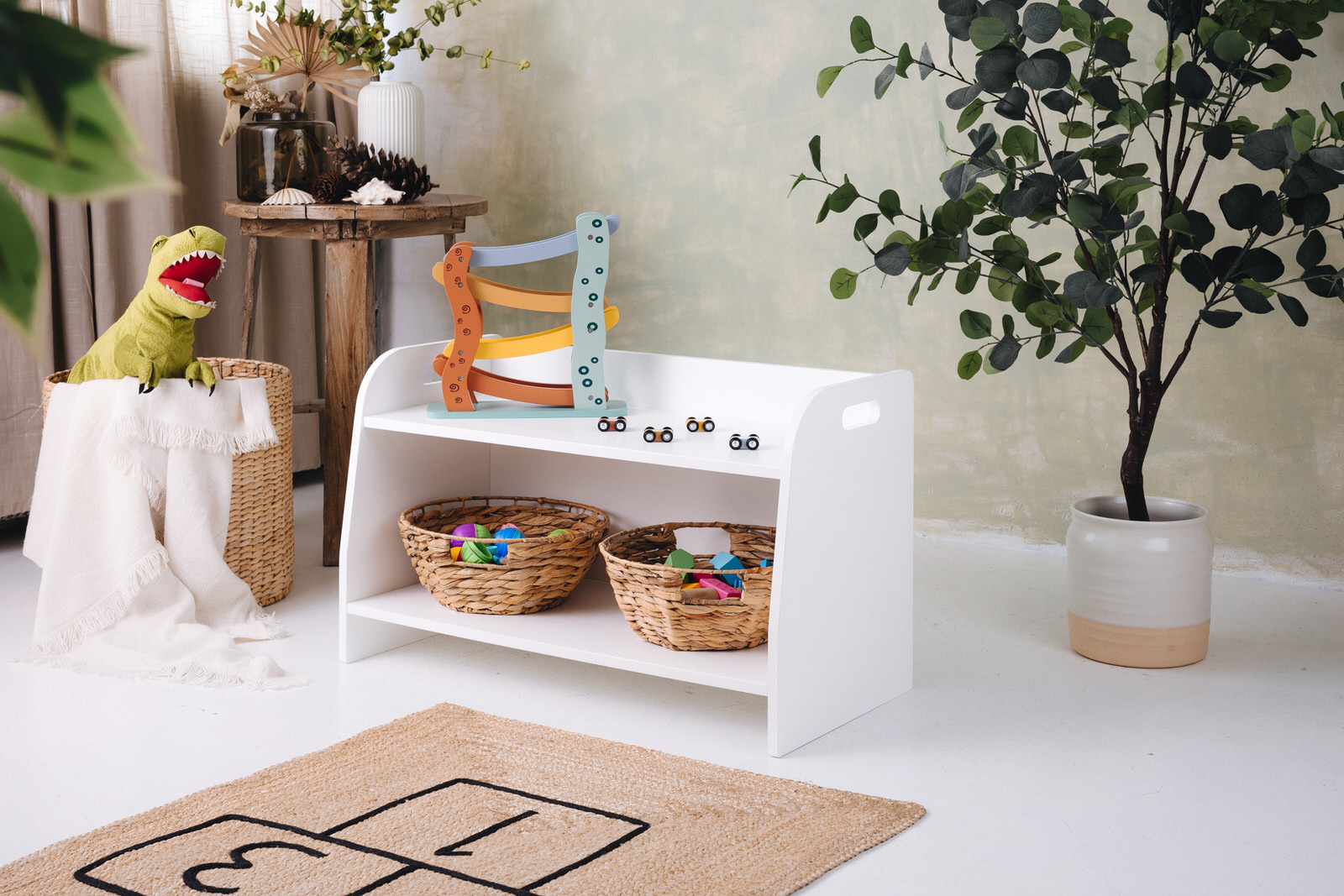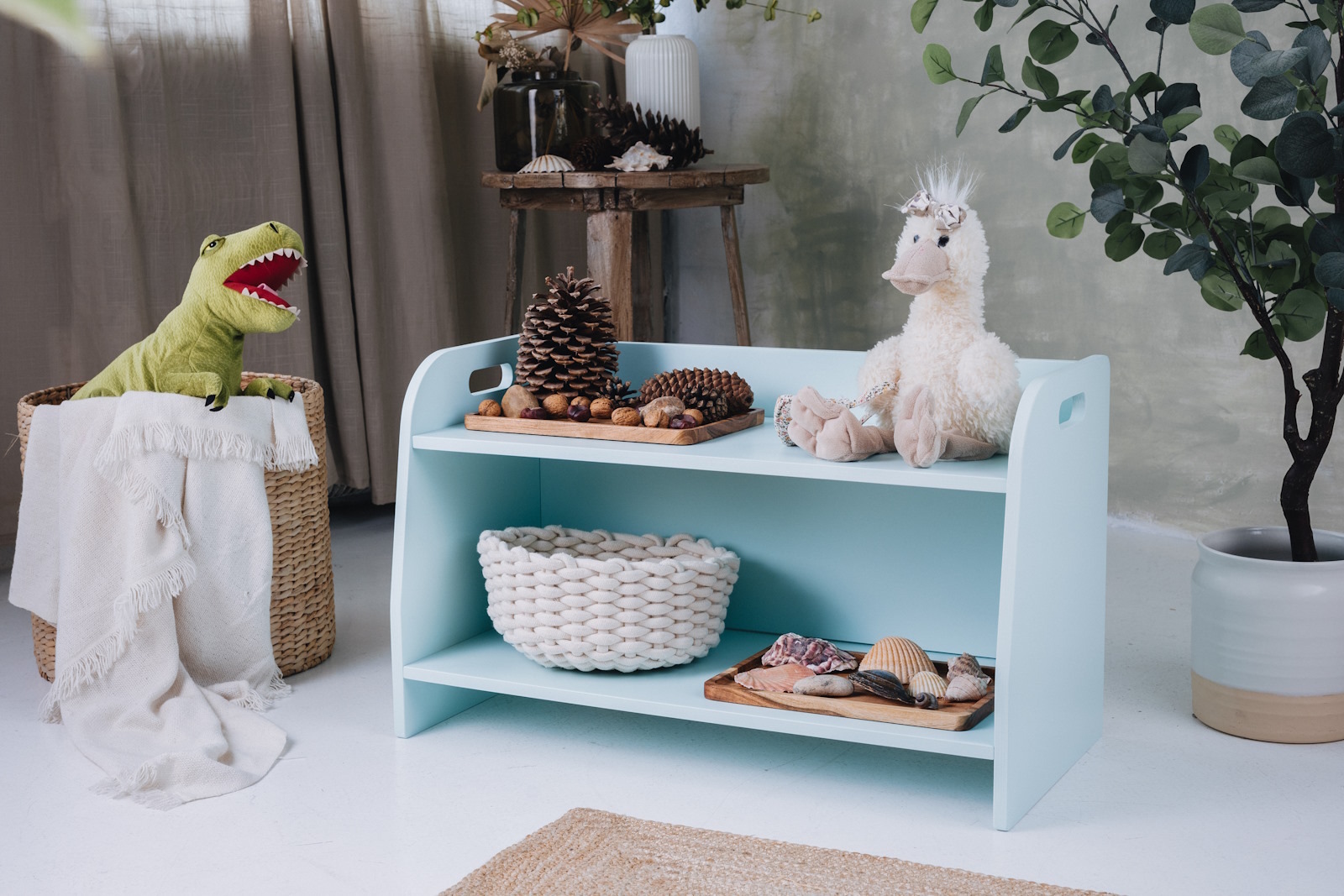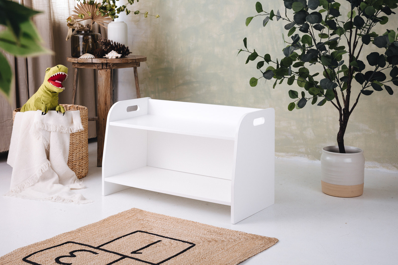 La estantería de juguetes tiene dos estantes a los que el niño tiene acceso ilimitado. El mueble se apoya directamente en el suelo y mide solo 44 cm de altura.