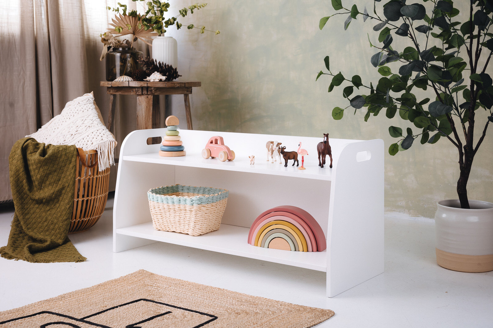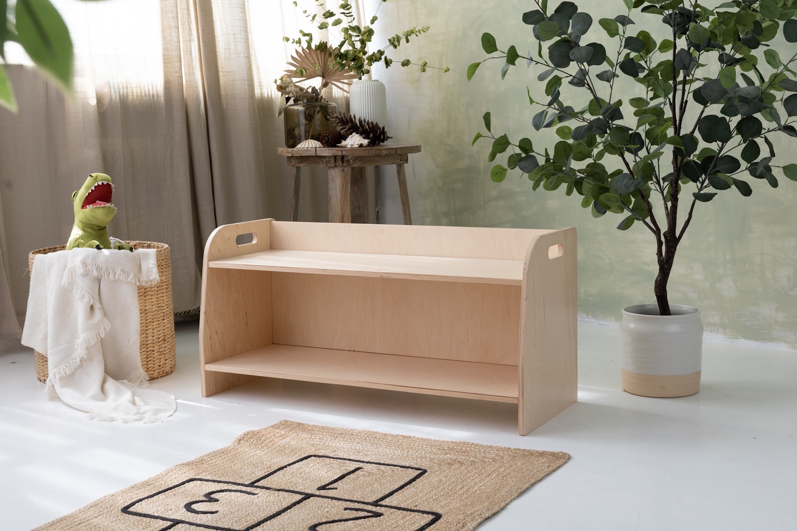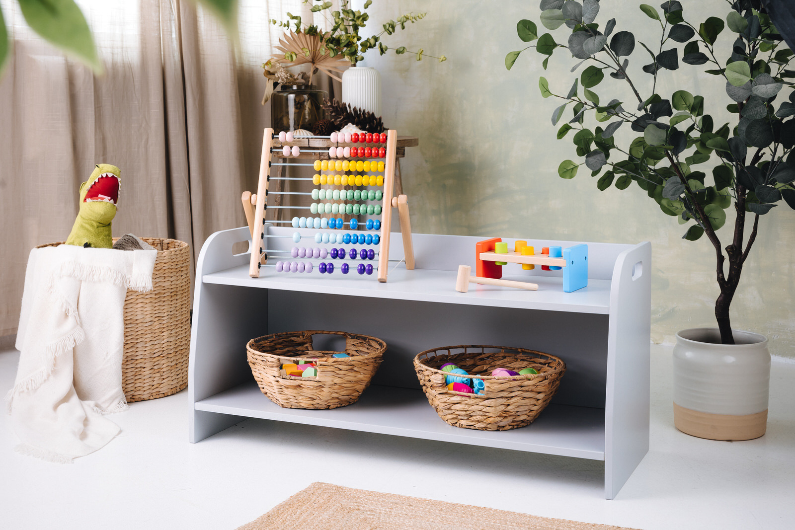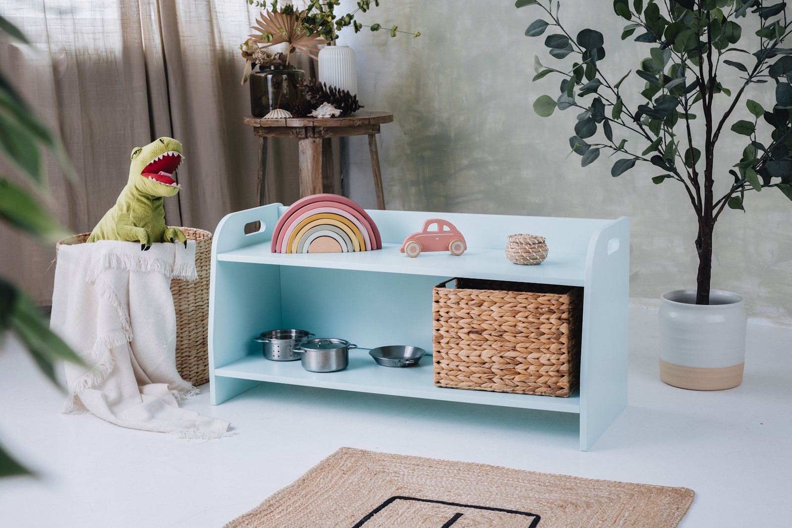 La estantería de juguetes tiene dos estantes a los que el niño tiene acceso ilimitado. El mueble se apoya directamente en el suelo y mide solo 44 cm de altura.