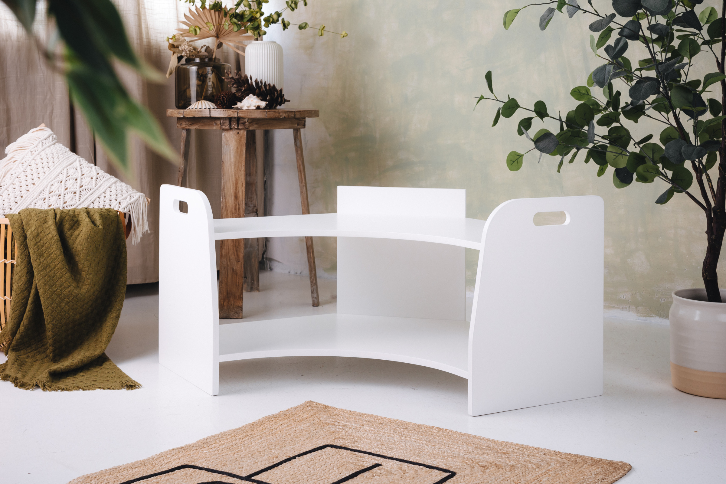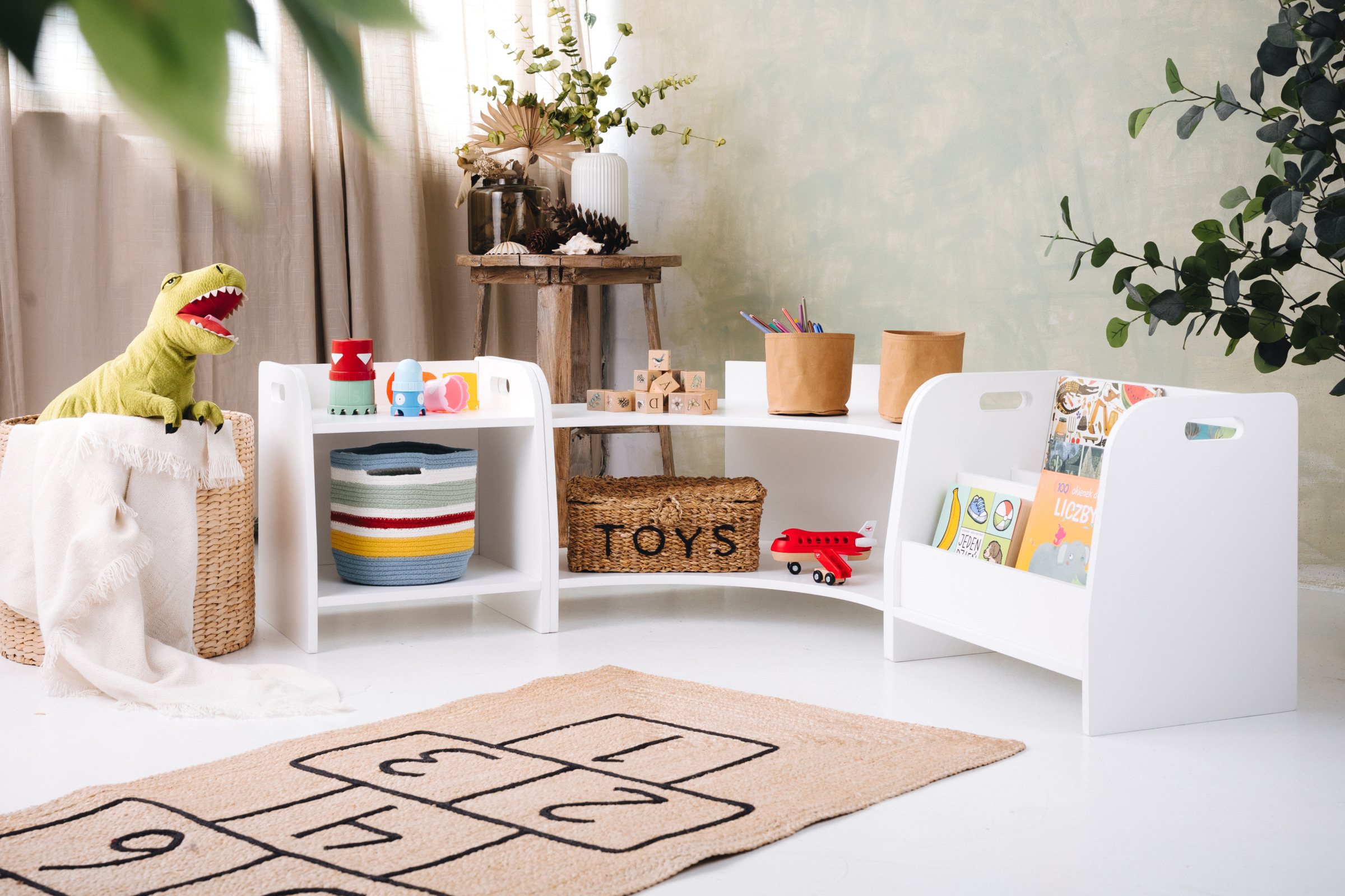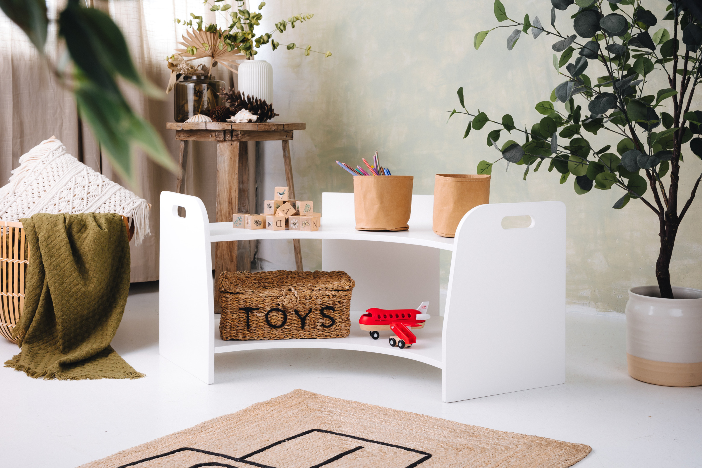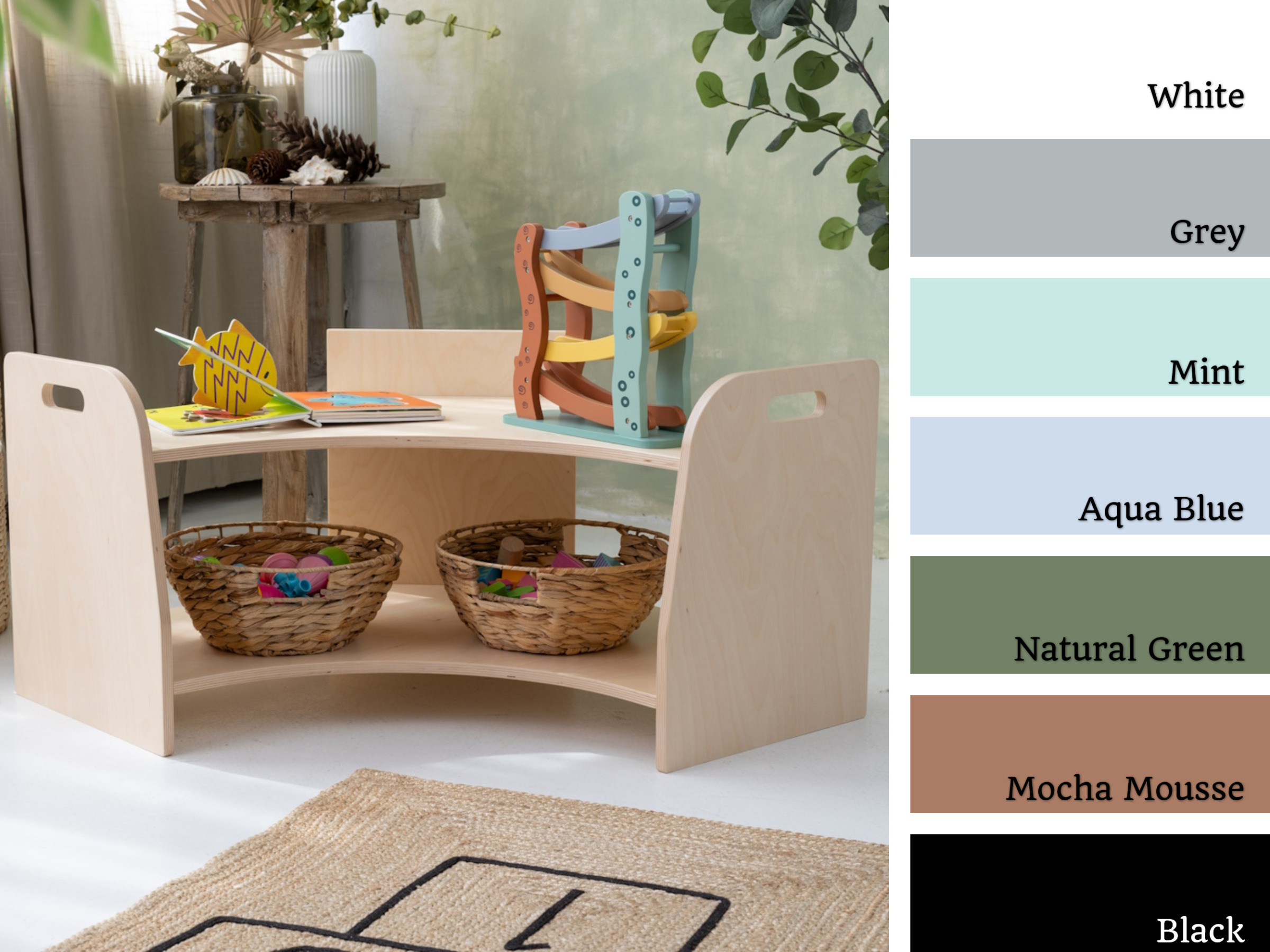 La estantería de juguetes tiene dos estantes a los que el niño tiene acceso ilimitado. El mueble se apoya directamente en el suelo y mide solo 44 cm de altura.