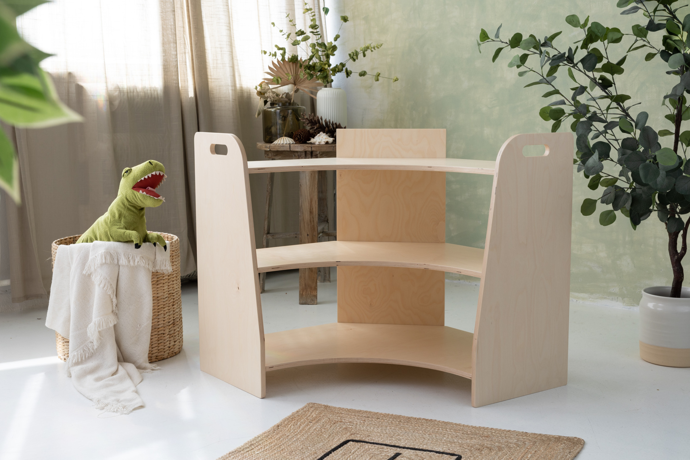 La estantería de juguetes tiene tres estantes a los que el niño tiene acceso ilimitado. El mueble se encuentra directamente en el suelo y mide solo 70 cm de altura.
