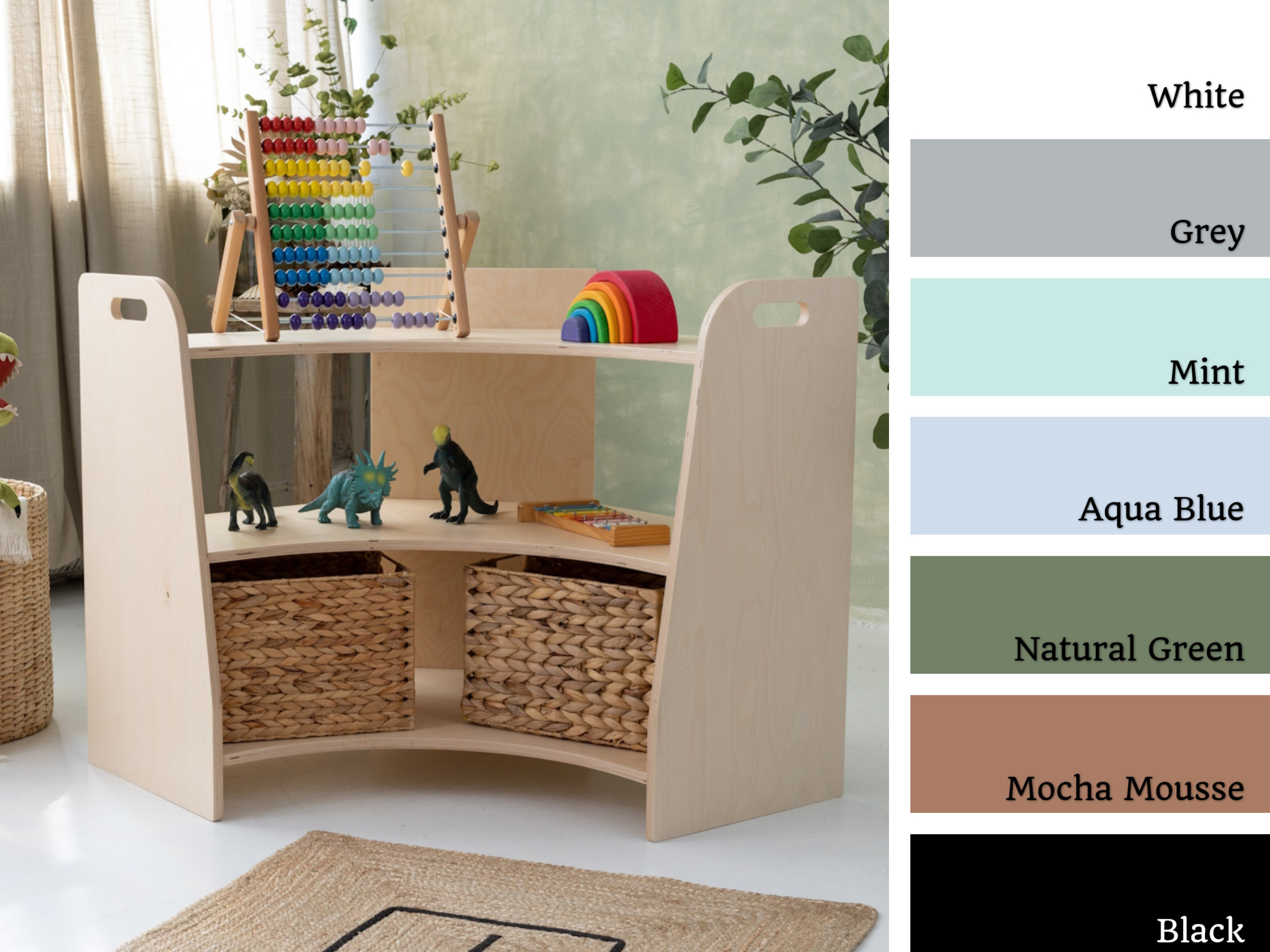 La estantería de juguetes está hecha a mano con contrachapado de 15 mm de grosor hecho de madera dura. Ha sido pintada completamente con pinturas respetuosas con el medio ambiente y seguras para los niños, y cumple con los requisitos de la norma europea PN EN 71.3, entre otros.