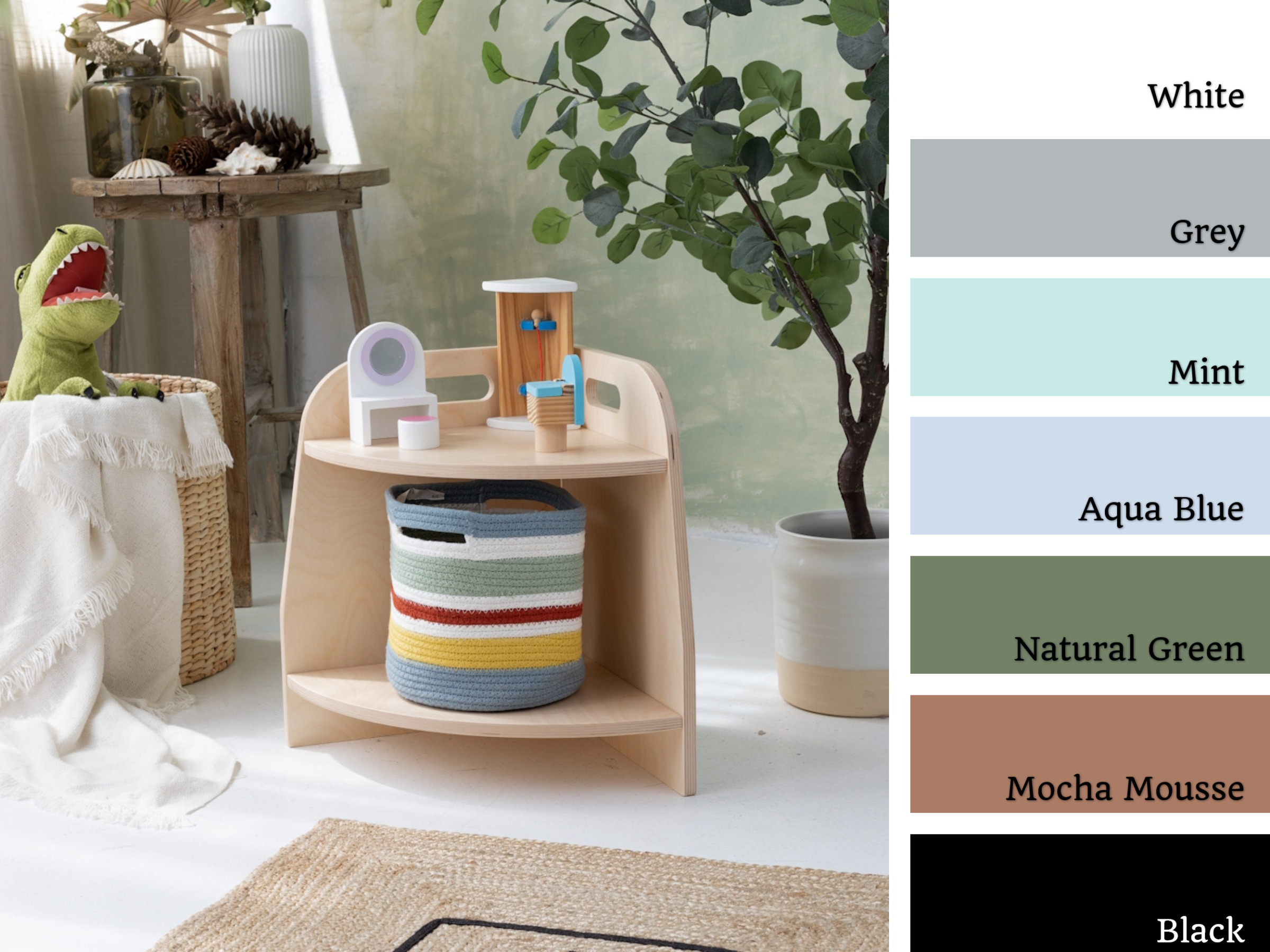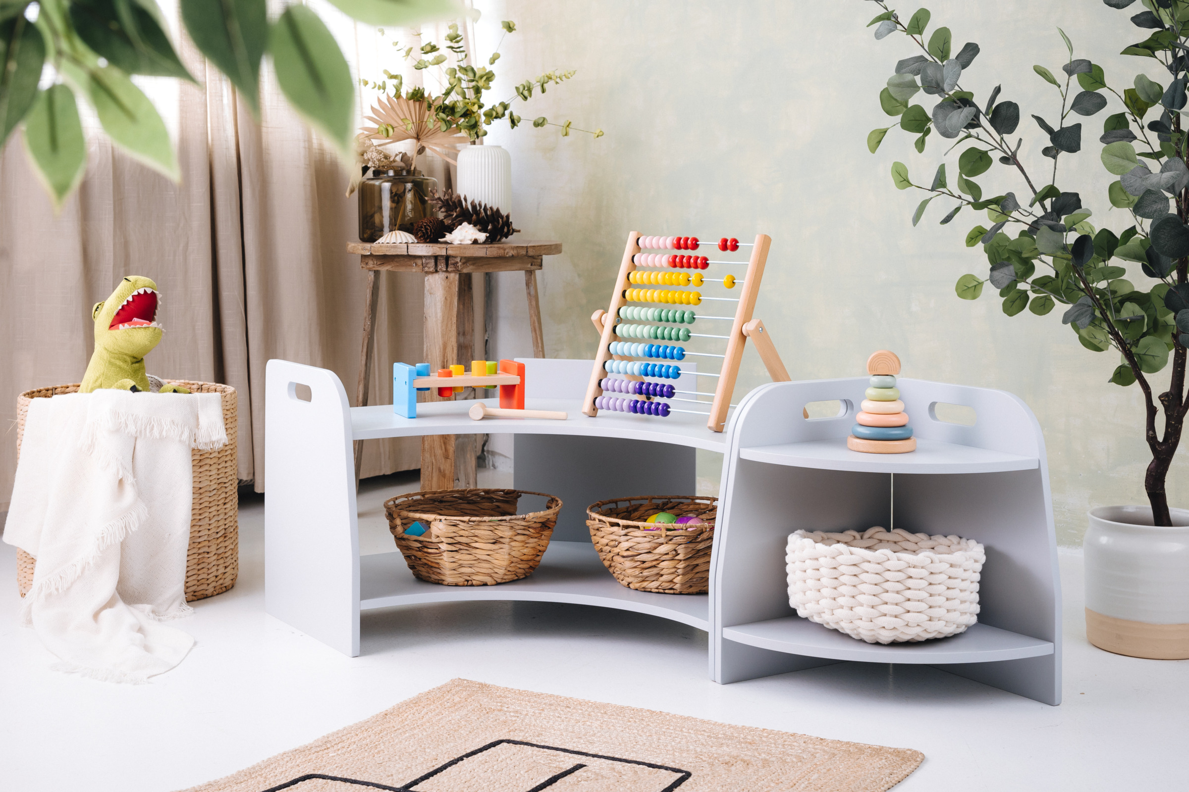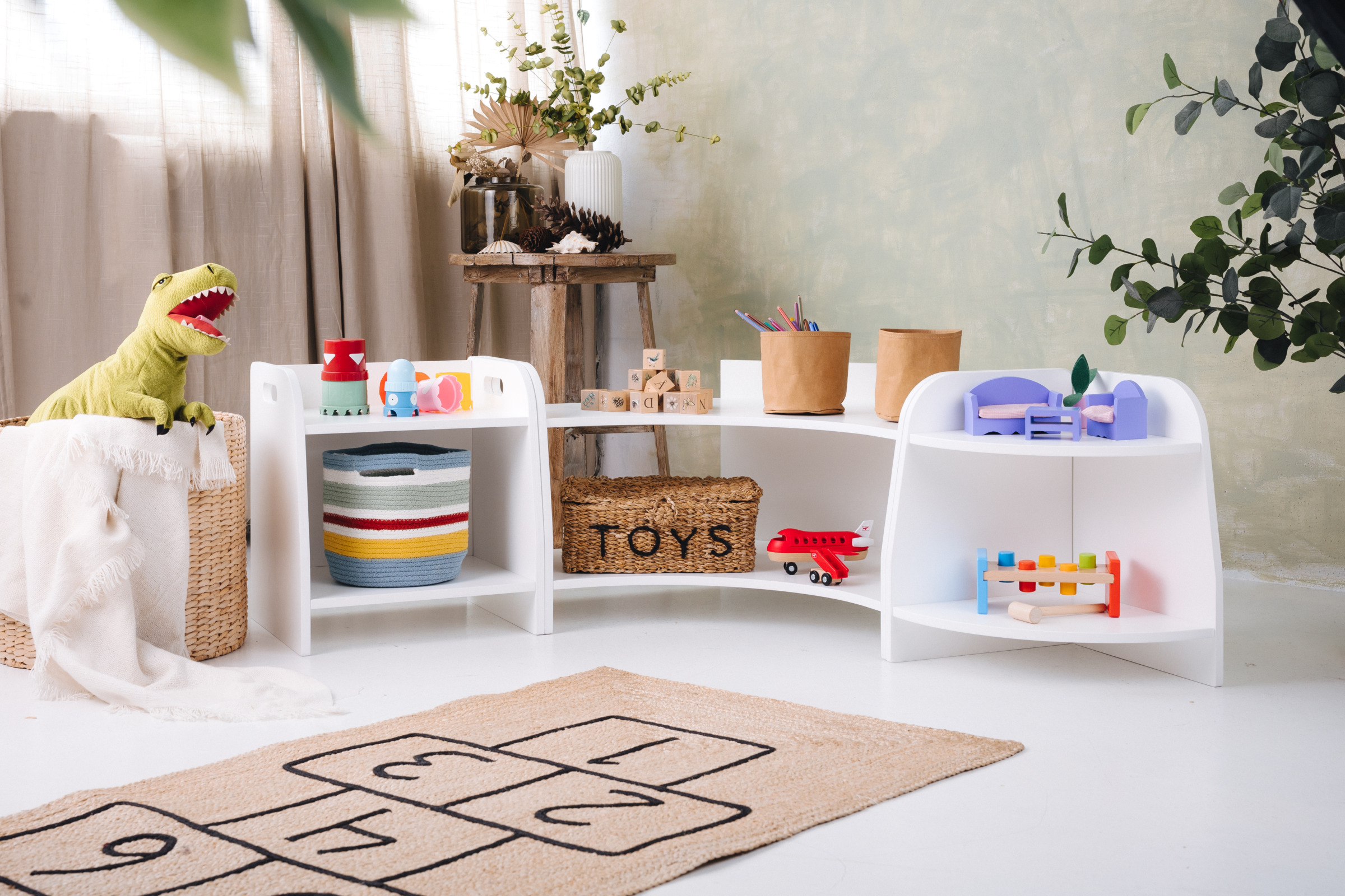 La estantería de juguetes tiene dos estantes a los que el niño tiene acceso ilimitado. El mueble se apoya directamente en el suelo y mide solo 44 cm de altura.