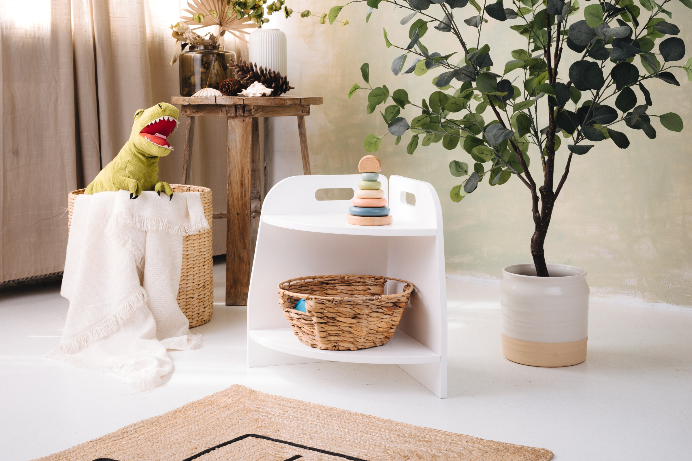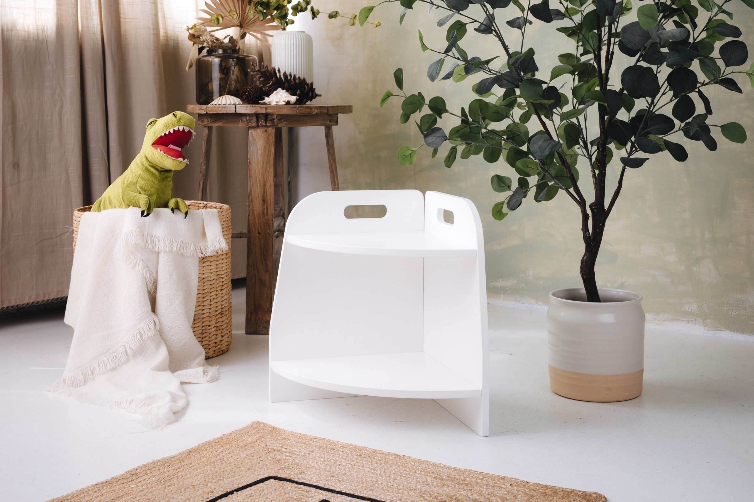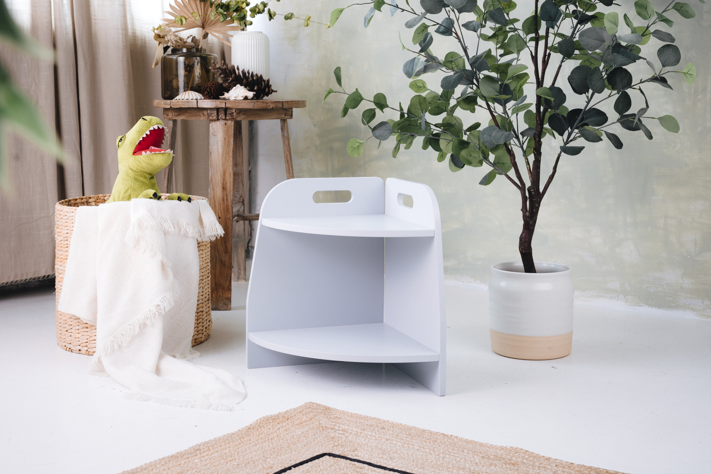 La estantería de juguetes tiene dos estantes a los que el niño tiene acceso ilimitado. El mueble se apoya directamente en el suelo y mide solo 44 cm de altura.
