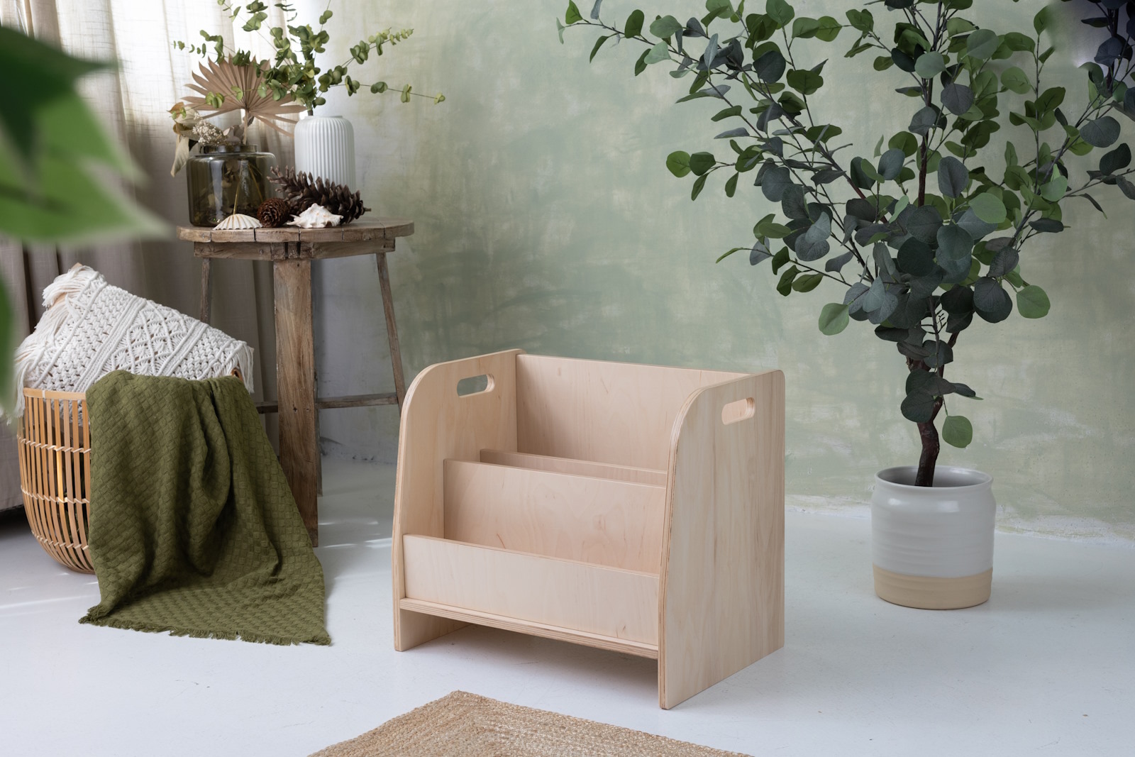 La estantería infantil está hecha a mano con contrachapado de 15 mm de grosor hecho de madera dura. Ha sido pintado con recubrimientos y pinturas respetuosas con el medio ambiente y seguros para los niños, que cumplen con los requisitos de la norma europea PN EN 71.3, entre otros.