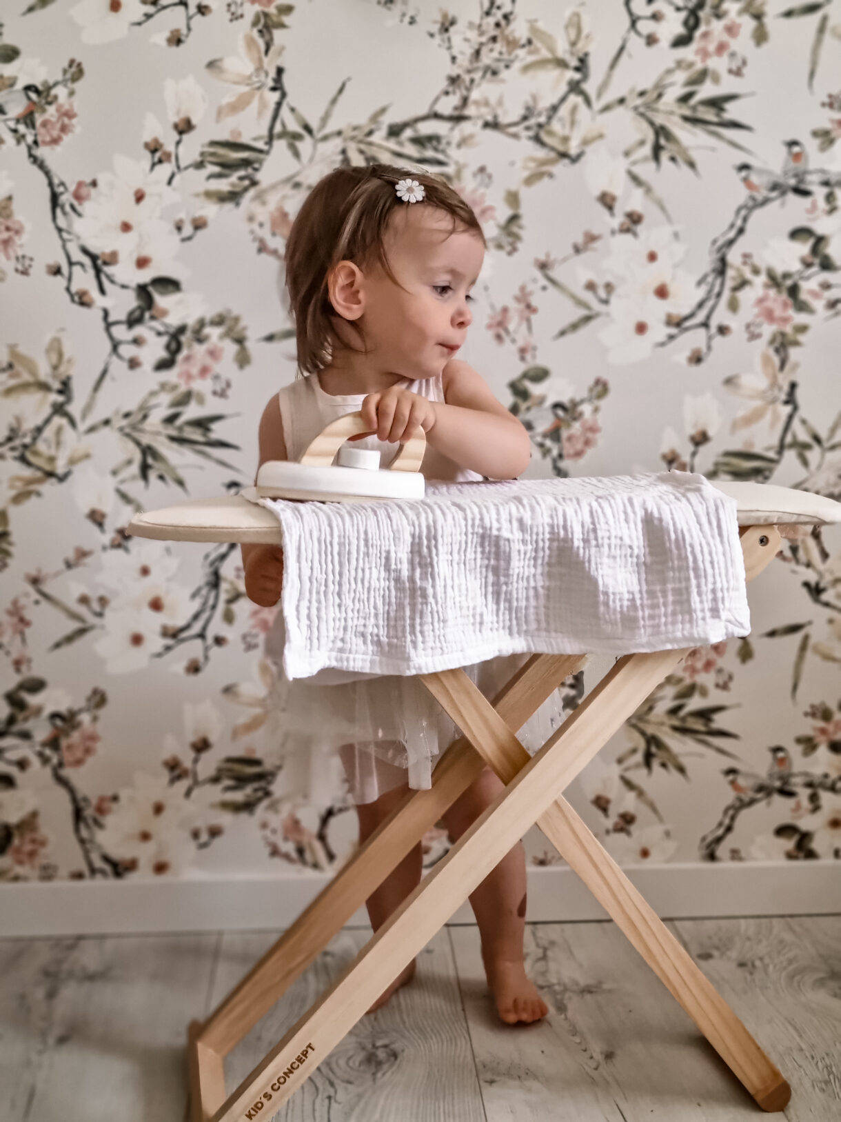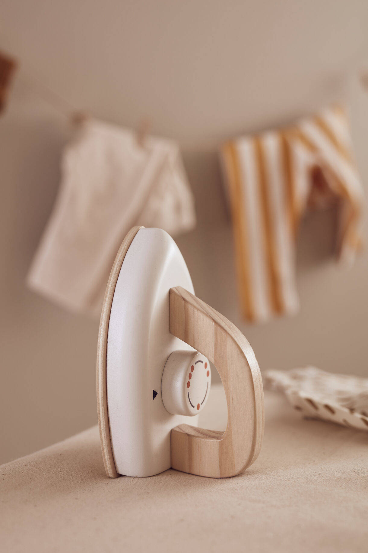 La tabla de planchar tiene una funda de algodón extraíble. El botón de la plancha emite un sonido de clic y se puede girar. El tablero es plegable y fácil de guardar cuando no se usa. A los niños les gusta hacer lo que hacemos los adultos. Planchar y jugar roles son parte del aprendizaje y brindan muchas horas de juego.
